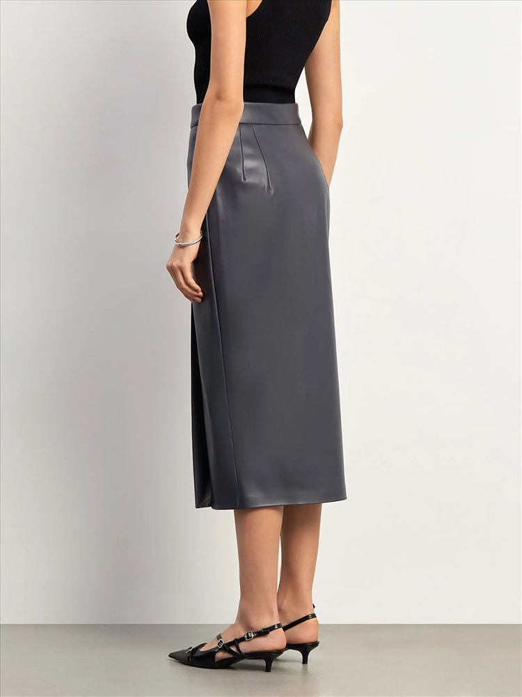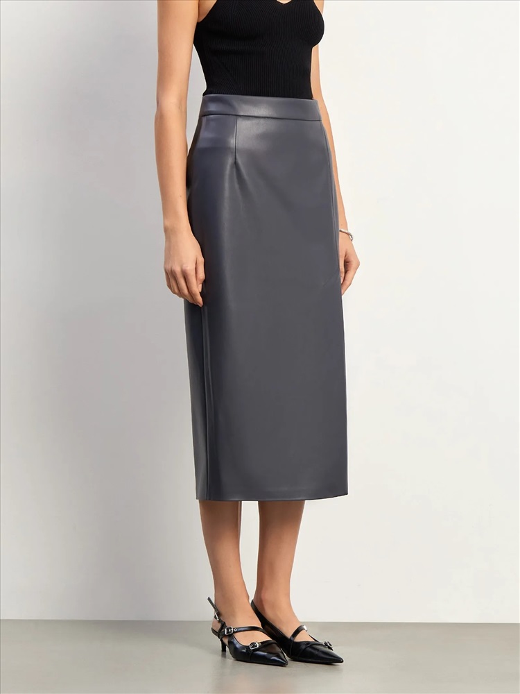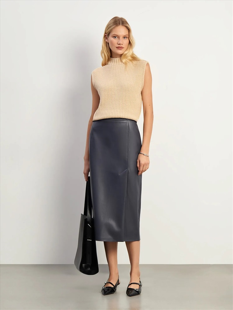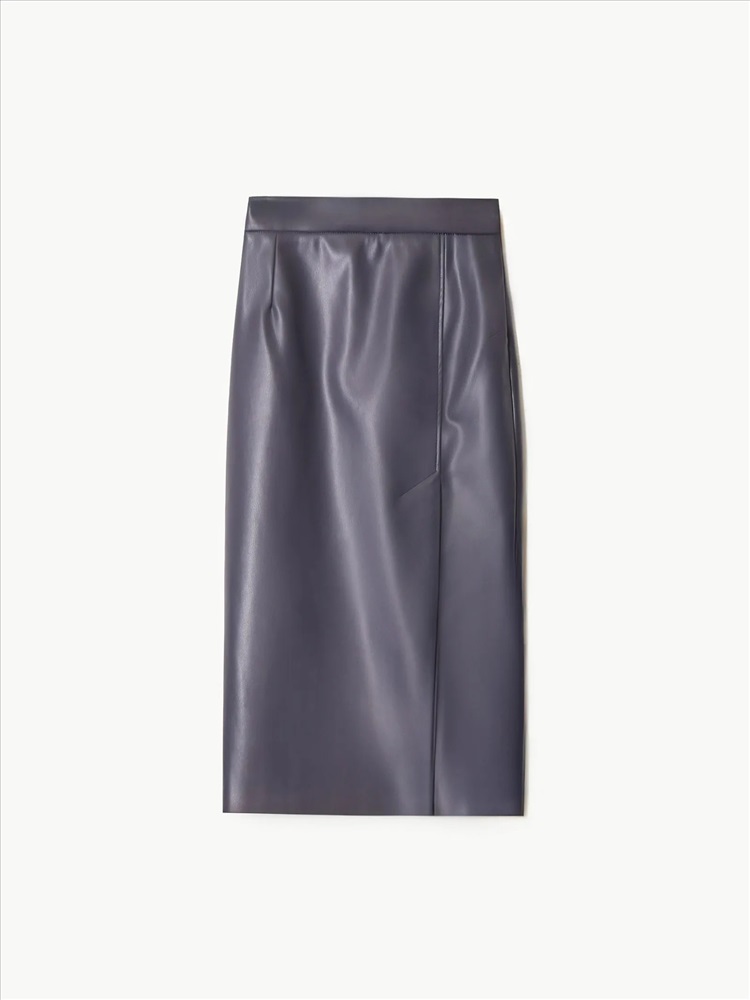 Незаменимая базовая вещь на демисезон. Юбка-карандаш выполнена из качественной экокожи, максимально приближенной по свойствам к натуральной. Практичный материал, универсальный серо-синий цвет, элегантный фасон "карандаш" с длиной ниже колена и высокой посадкой делают её отличным выбором на каждый день. Сочетается с любыми рубашками и трикотажем, а также нарядными блузами разных фактур. Модель имеет боковой разрез со шлицей. Выполнена без подкладки.