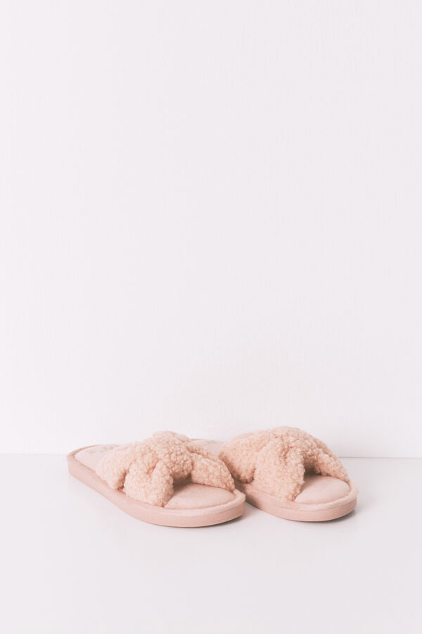 Zapatilla de estar por casa, abiertas y acolchadas con textura de borreguito. Ideal para complementar tus looks de estar por casa.