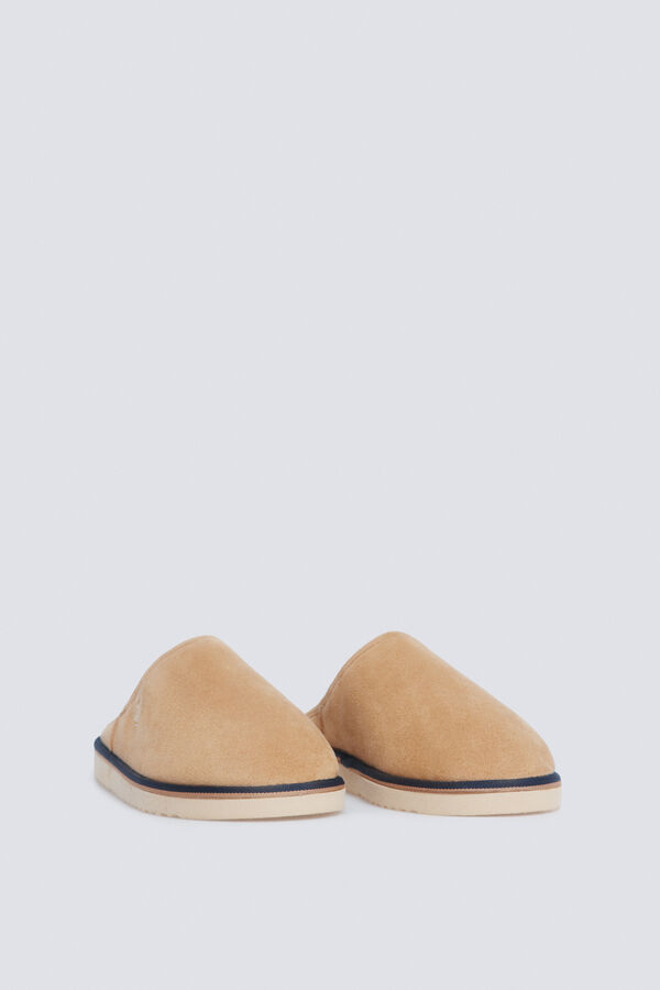Zapatilla de estar por casa destalonada, disponible en dos colores, confeccionada en tejido cálido, y forro de pelo envolvente, suele con ligero volumen.