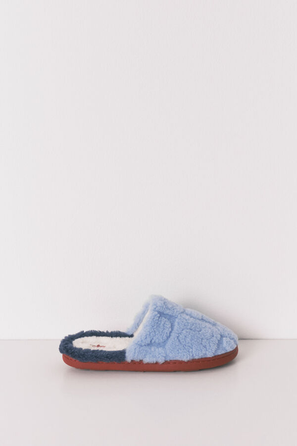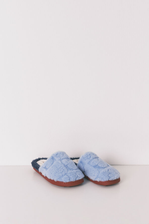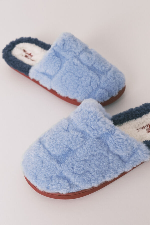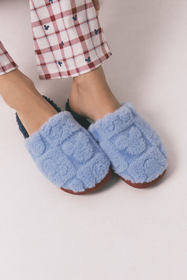 Zapatilla de estar por casa, en color azul y calandradas con la silueta de Mickey Mouse.