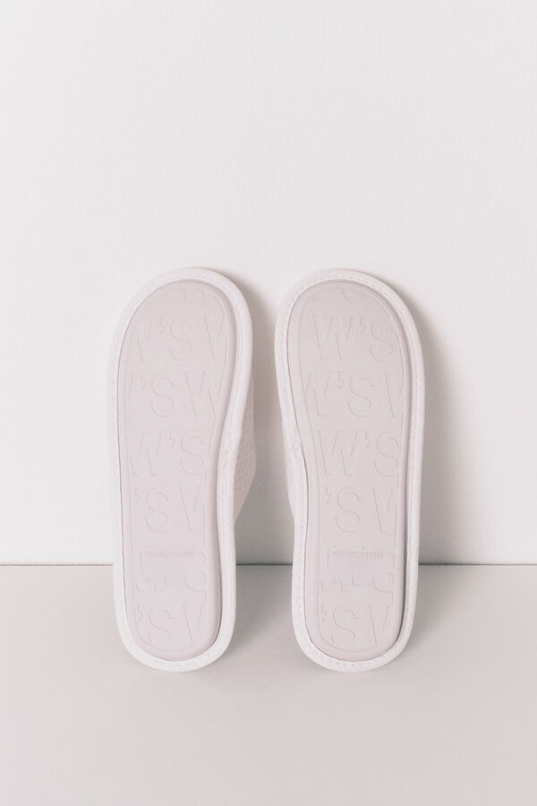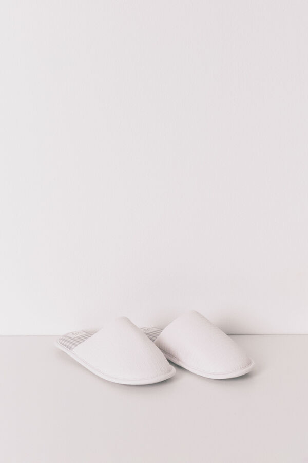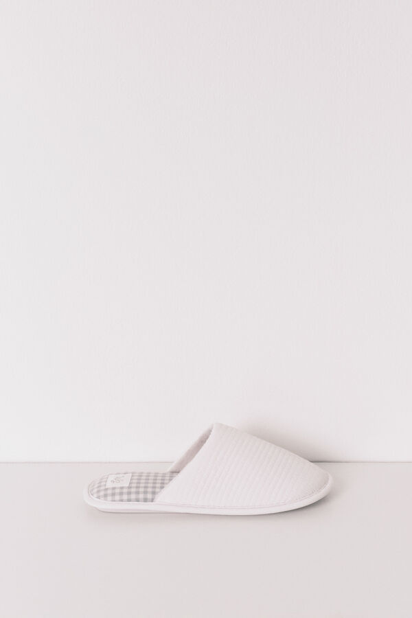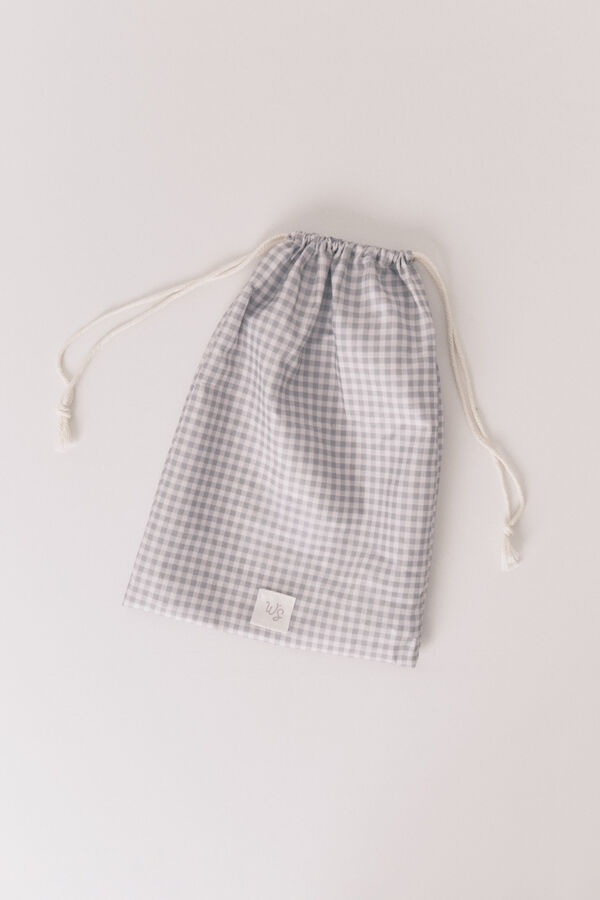 Zapatillas cerradas para maternity, en color gris claro, con textura en la pala y con bolsita para transportarlas con estampado en cuadros vichy. Ideal para mantener tu comodidad durante el embarazo y postparto.