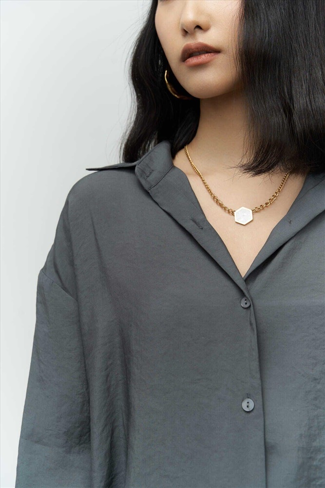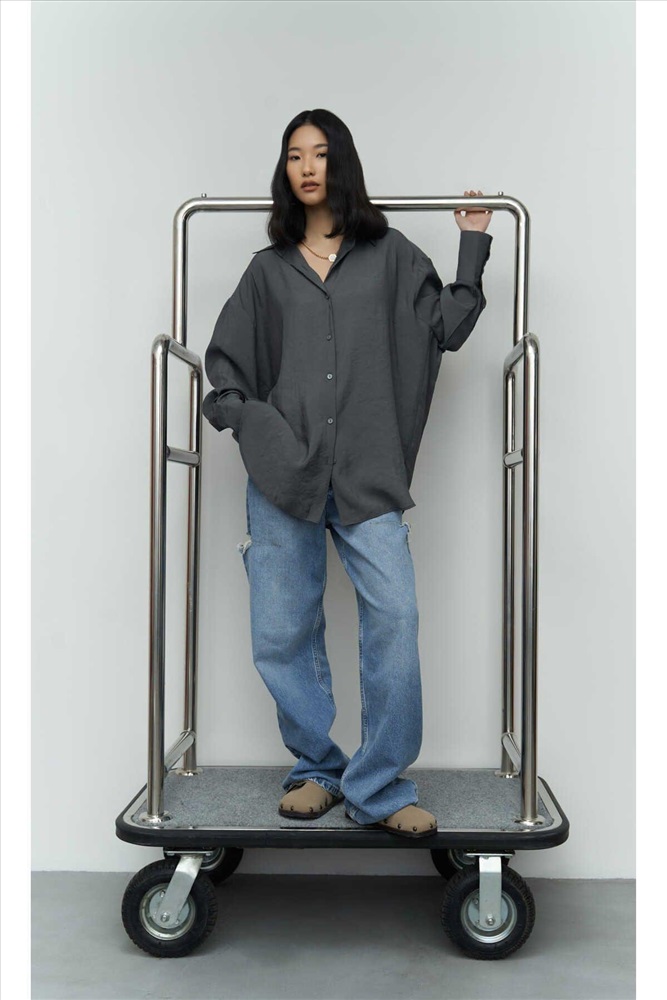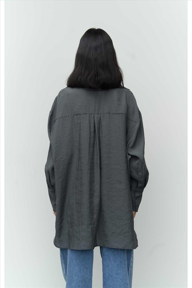 Рубашка оверсайз с длинными рукавами с воротником и манжетами, петлей спереди, кокеткой сзади, закругленным подолом и чуть более длинной спиной. Содержание ткани: 85% модал 15% полиэтилен, полиэстер и целлюлоза
