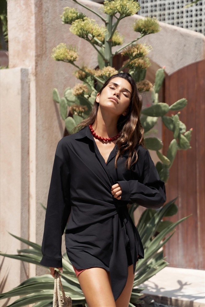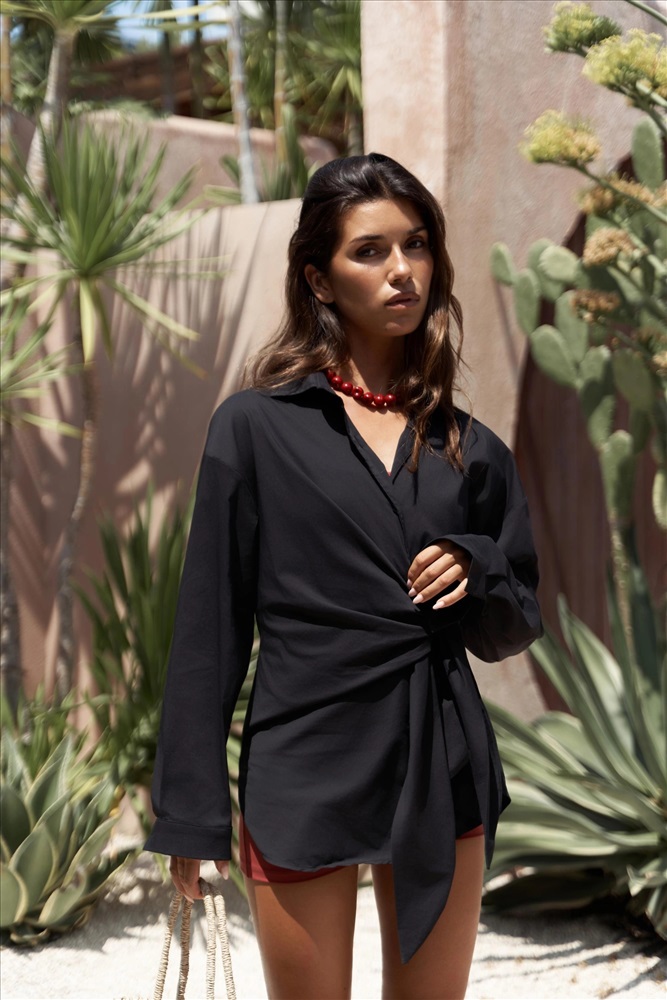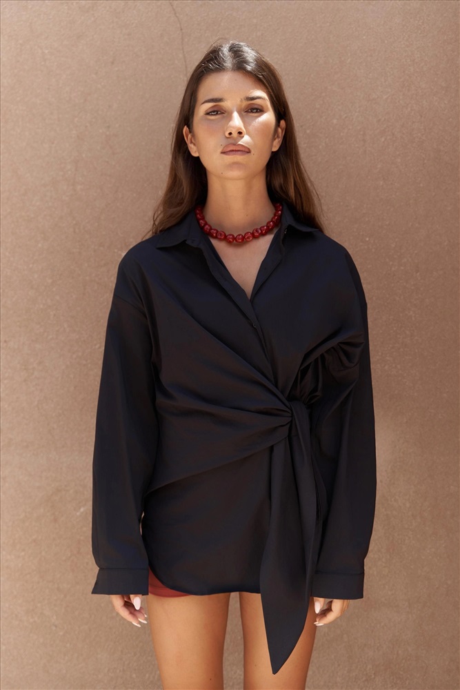 Рубашка оверсайз с длинными рукавами с воротником и манжетами, петлей спереди, кокеткой сзади, закругленным подолом и чуть более длинной спиной.