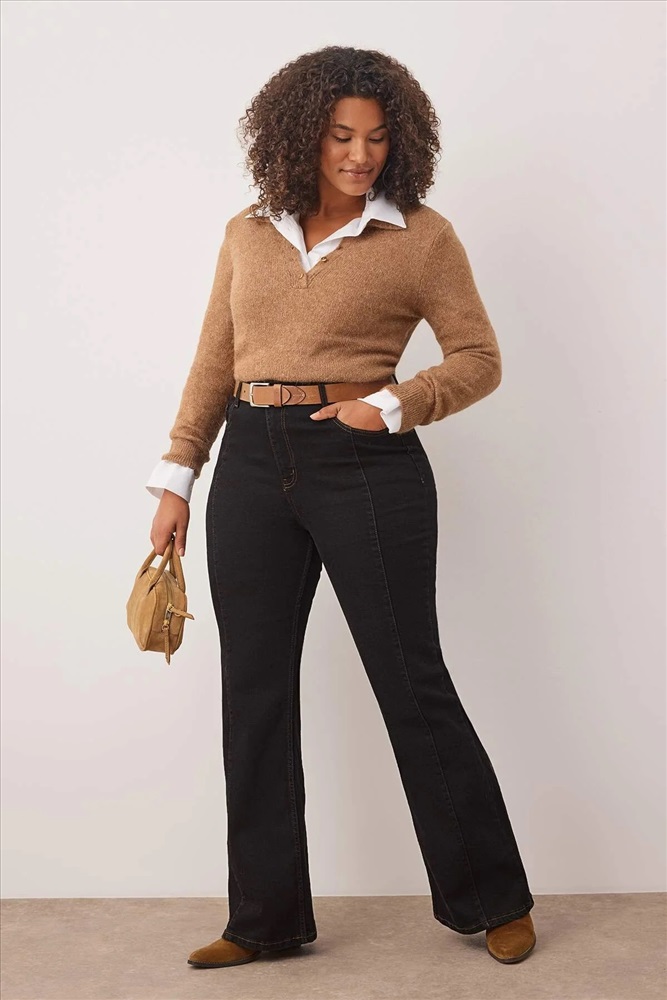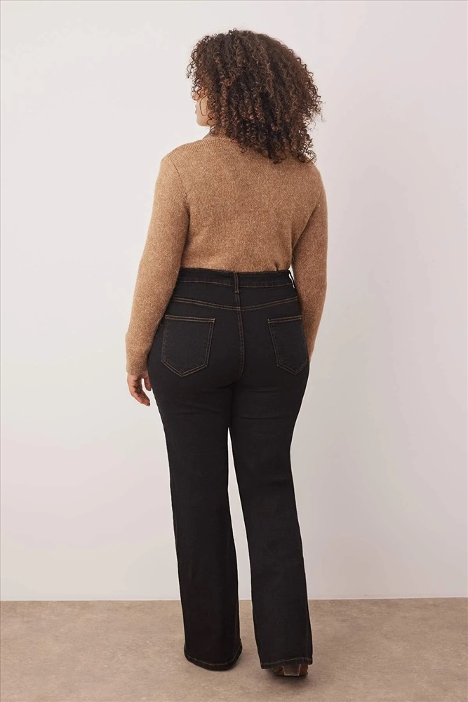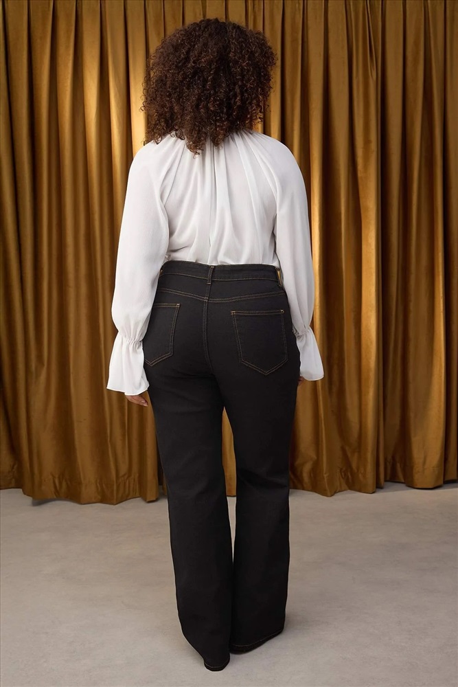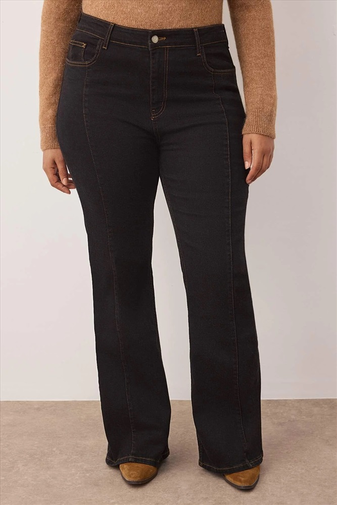 Özel Koleksiyon Siyah Yüksek Bel Nervürlü İspanyol Paça Büyük Beden Flare Jeans TBBAW26CJ00013