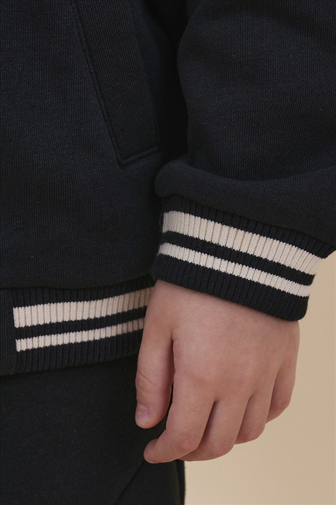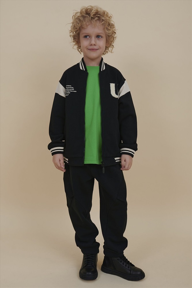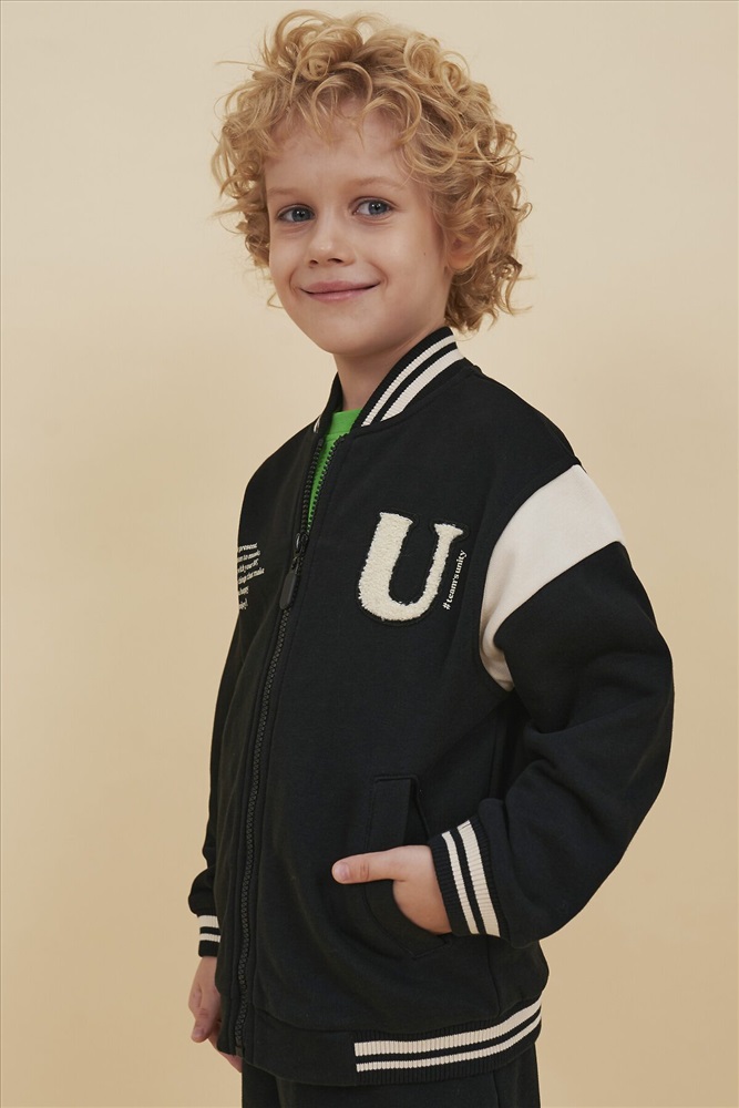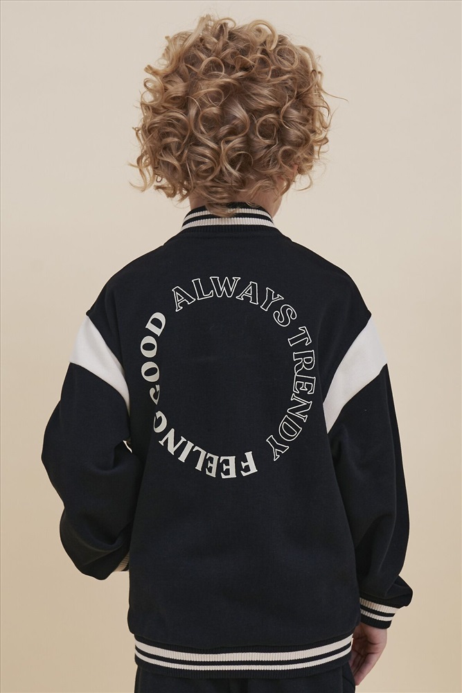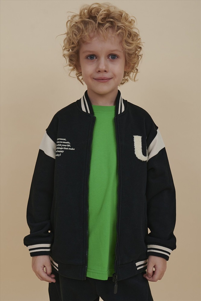 Бомбер для мальчика – трикотажная модель свободного кроя на позднюю весну, лето. Уютная вещь для создания стильного образа. Жакет для мальчика легко сочетать с любым низом, использовать для многослойных образов. Куртка бомбер для мальчика идеальна в качестве плотной кофты для прохладного помещения. Трикотажная куртка выполнена из смесовой ткани с высоким содержанием хлопка и небольшим добавлением полиэстера. Материал хорошо пропускает воздух, обеспечивает здоровую гигроскопичность. Ребенок не потеет и комфортно чувствует себя во время активных игр и занятий спортом. Наличие полиэстера наделяет жакет для мальчика повышенной износоустойчивостью к усадке, защитой от образования катышек. Изделие не линяет после стирки и сохраняет красивый внешний вид. Детский бомбер на центральной застежке молнии, со спущенным плечом и углубленной проймой. Воротник, манжеты по рукавам и низу изделия - из декоративного полосатого риба – стильная резинка в университетском стиле. На рукавах вставки из основного материала контрастного цвета. Боковые карманы с листочками расположены на переде под наклоном. Детский жакет для мальчика украшен модным университетским шрифтом с засечками. Перед декорирован нашивкой – объемной мягкой аппликацией из бербер-флиса (барашек) и графичной шрифтовой композицией. Меховая нашивка буквой "U": unity – перевод "единство, командная сплоченность". Надпись: "Be present, listen to music, be with you BF, do things that make you happy #enjoy!" - перевод "Живи в моменте, слушай музыку, встречайся со своим лучшим другом, делай то, что делает тебя счастливым #наслаждайся!". На спине круговая шрифтовая композиция: "Feeling good always trendy" - перевод "Хорошее настроение всегда в тренде (модно)". Куртка бомбер для мальчика подростка представлена в размере для малышей и школьников. Размерная линейка: 1 (86): 2 (92): 3 (98): 4 (104): 5 (110): 6 (116): 7 (122): 8 (128): 9 (134): 10 (140): 11 (146). Бомбер для мальчика - отличный подарок для сына, внука, братика, племянника, крестника! Выбирайте нужный размер по таблице размеров на фото. Цвет товара на экране вашего устройства может отличаться от цвета изделия вживую.