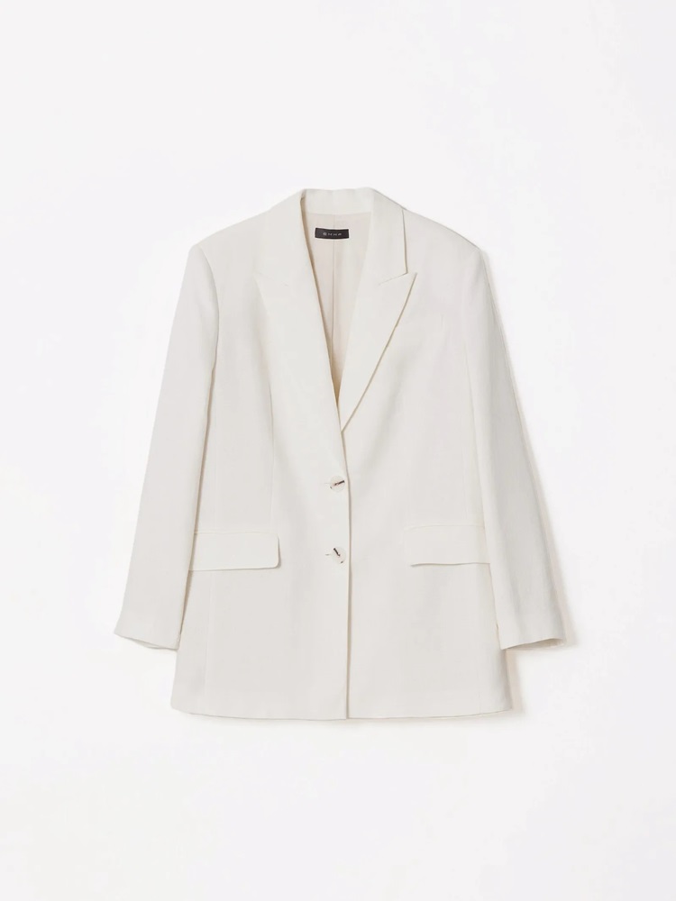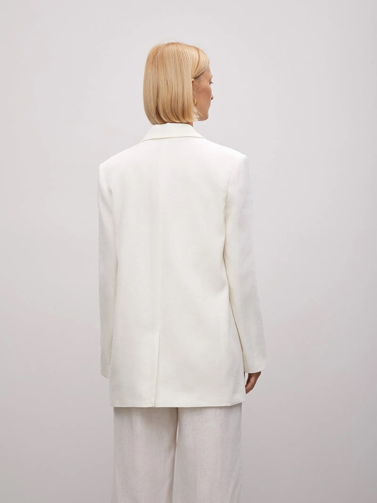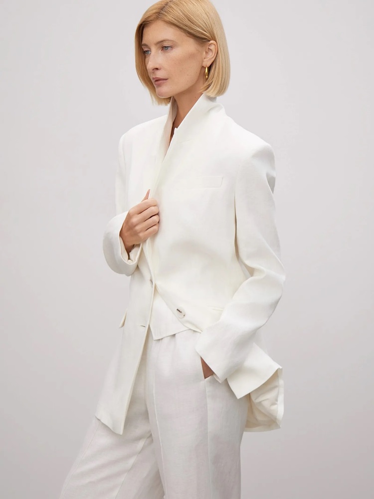 Летний жакет молочного цвета изо льна освежит повседневные образы. Удлинённая модель прямого кроя застёгивается на две пуговицы. На уровне бёдер располагаются карманы с широкими клапанами. Дополнить жакет можно брюками и жилетом из комплекта. Изделие выполнено на комфортной подкладке c хлопком в составе.