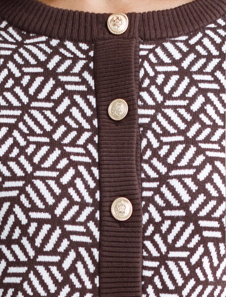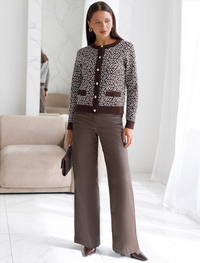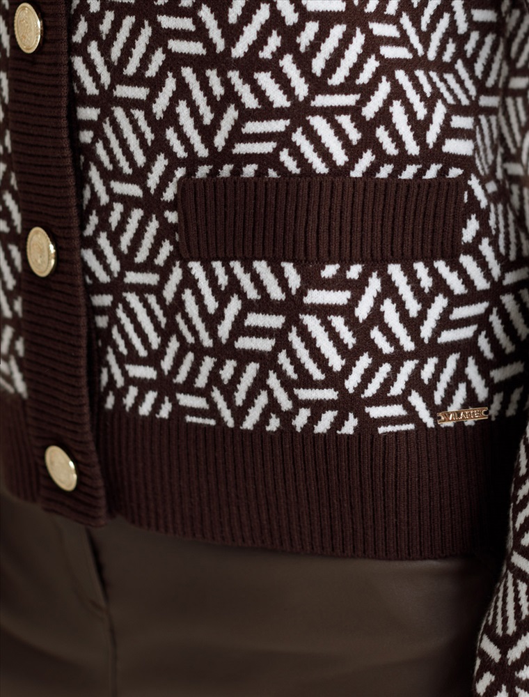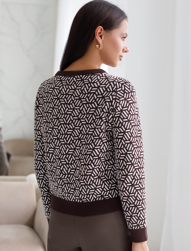 Плотность: 12 GG Параметры модели на первом фото: Рост 170, бюст 83, талия 64, бедра 88 Жакет жаккардовой вязки выполнен из нежной пряжи на основе вискозы с добавлением кашемира. Модель с круглым вырезом и золотистой фурнитурой выглядит дорого и роскошно, приятно ощущается на теле и поддерживает комфортный микроклимат. Совет стилиста: сочетайте с однотонными брюками, юбкой, платьем или джинсами. Можно использовать в комплекте total-look с D39.362 и с платьем D32.110 Комментарии к товару