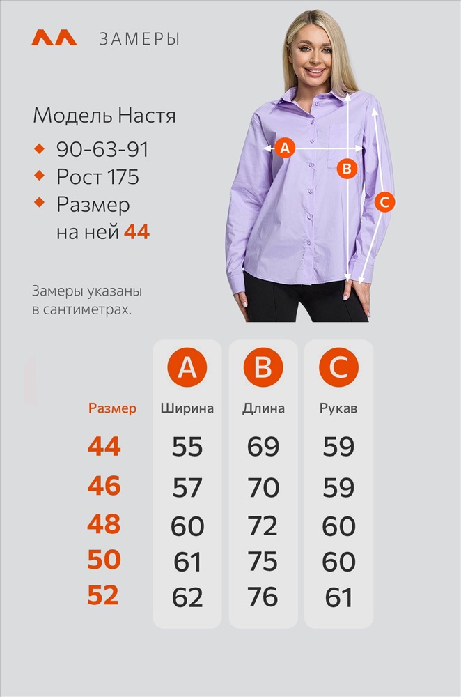 Модель Настя, ее рост 175 см, параметры 90-63-91 см. На ней размер 44.