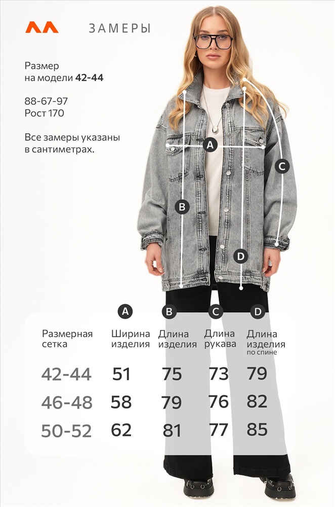 Размер 42-44: длина спереди: 75 см; длина по спинке: 79 см; ширина:51 см; длина рукава внешняя: 73 см; длина рукава внутренняя: 50 см.