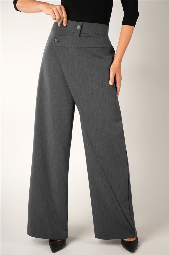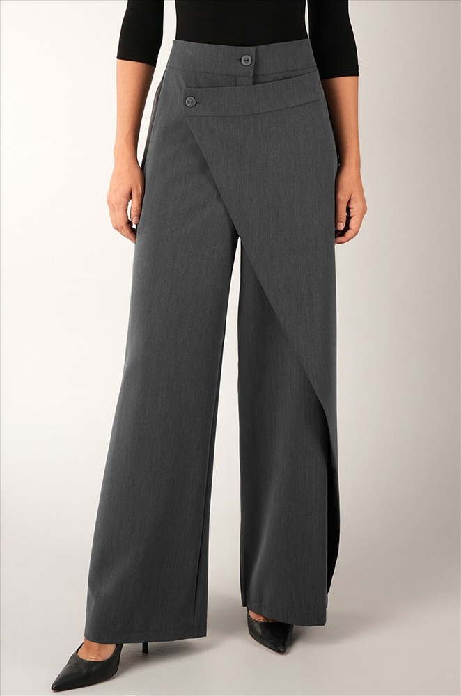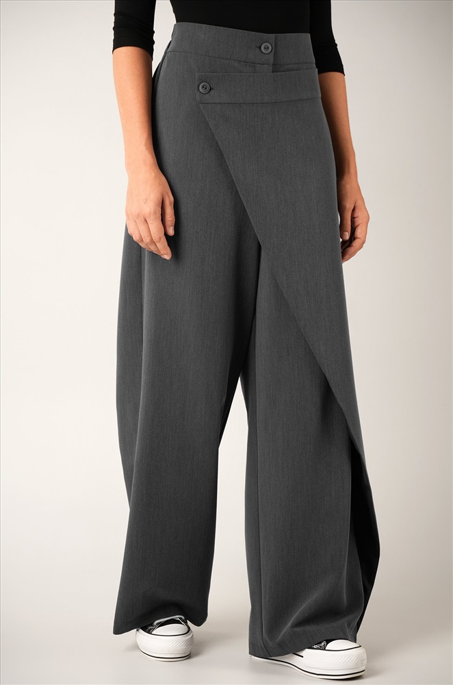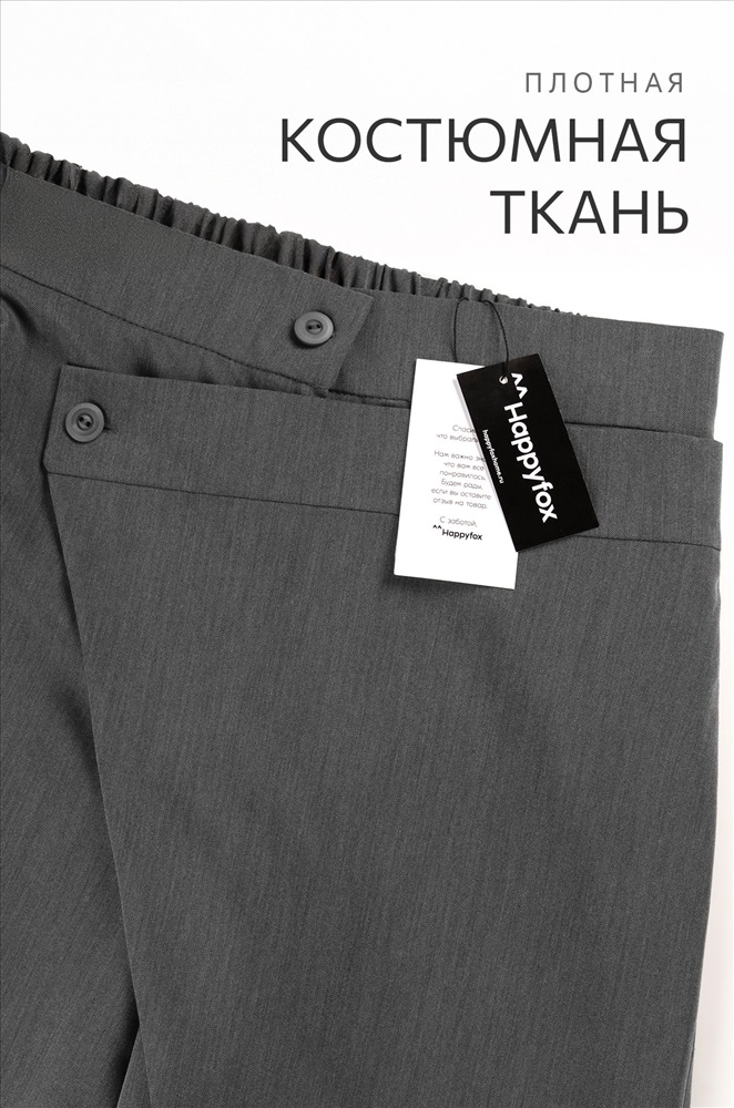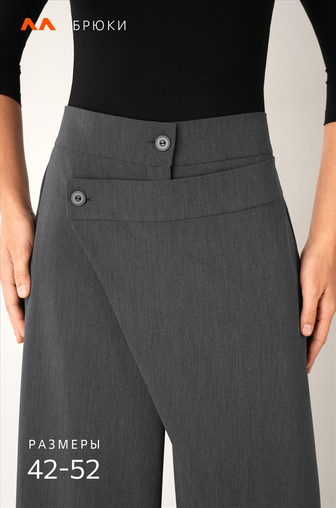 Стильные асимметричные женские брюки в элегантном сером цвете — идеальное сочетание комфорта и изящества. Классика с оригинальными элементами в виде запаха и аккуратной застёжки на пуговицу подчеркнёт индивидуальность и подойдёт для девушек и женщин, ценящих практичность и эстетику.