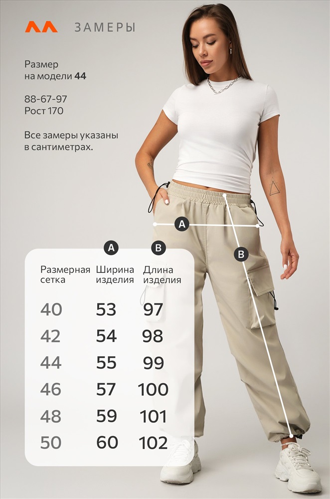 Размер 48:длина по внешнему шву:101 см; длина по внутреннему шву:68 см; ширина по бедрам:59 см.
