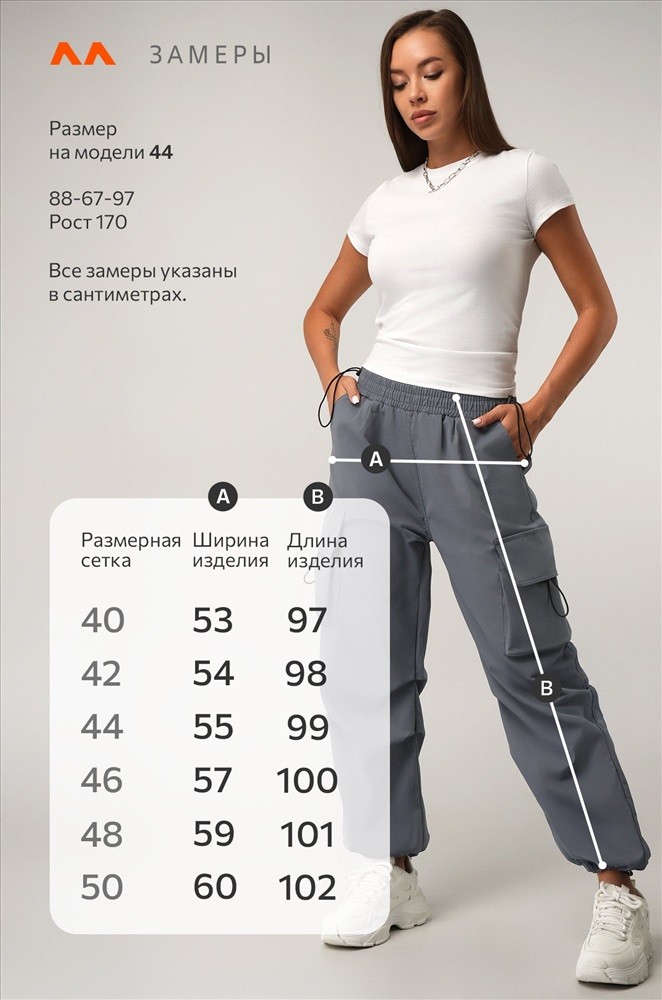 Размер 40:длина по внешнему шву:97 см; длина по внутреннему шву:66 см; ширина по бедрам:53 см.