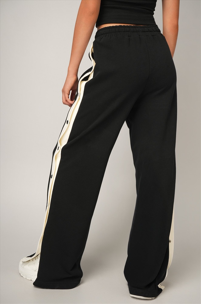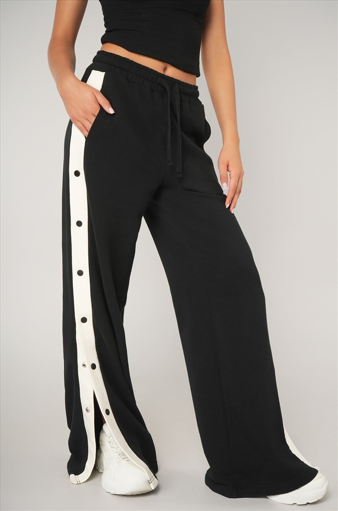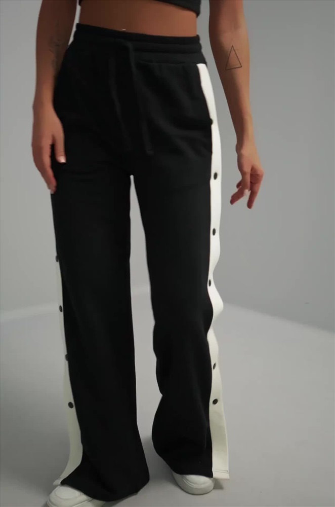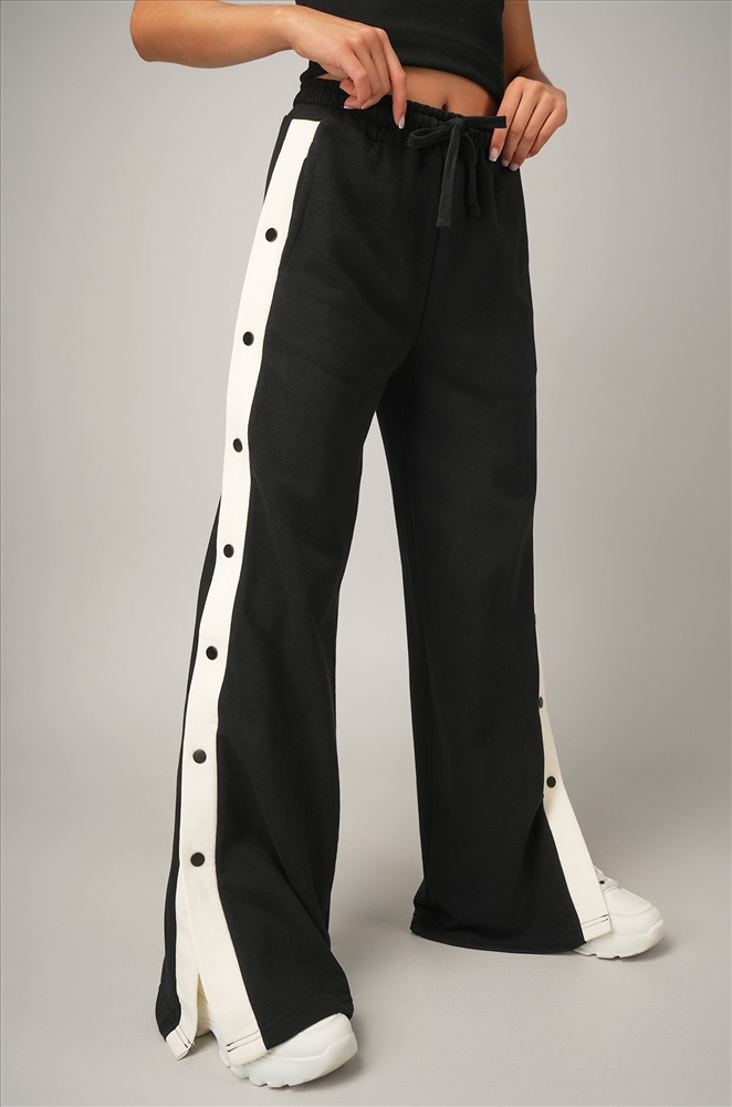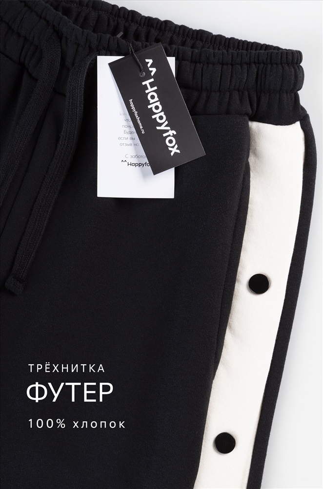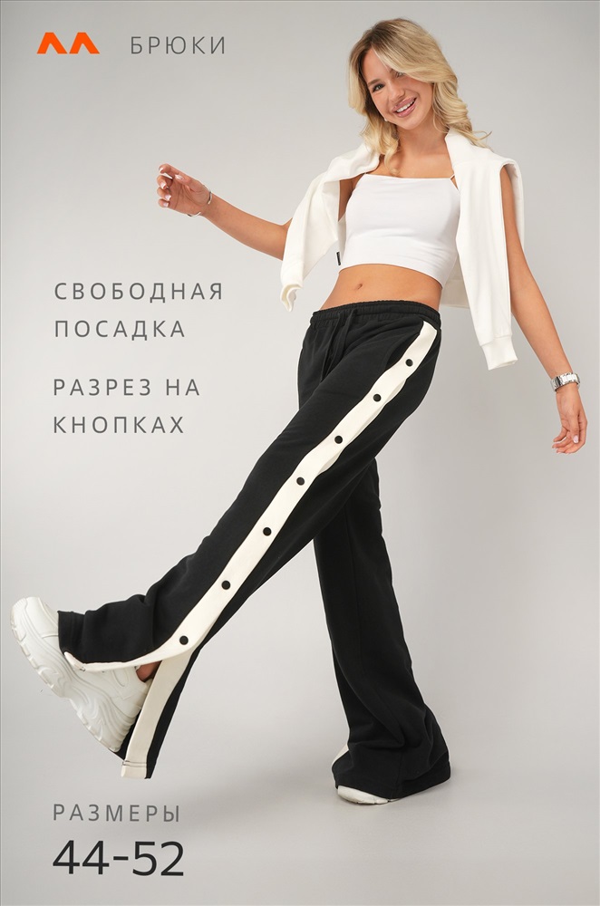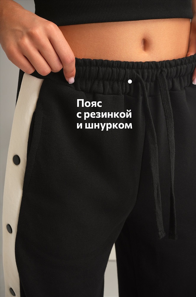 Эффектные женские брюки и выразительный спортивный стиль! Черные трикотажные штаны с контрастной отделкой и застежкой на кнопки сбоку сразу привлекают внимание — это идеальный вариант на каждый день в демисезонные месяцы весны и осени.