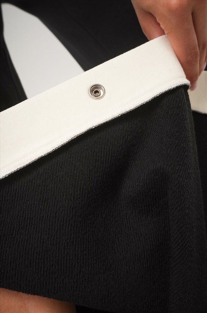 Прямой крой и широкие удлиненные штанины создают свободный силуэт, который не стесняет движения. Широкая резинка на поясе с регулирующим шнурком придает идеальную посадку по фигуре. Контрастная белая полоса визуально вытягивает силуэт, а застежка на клепки по бокам и функциональные карманы добавляют оригинальности и удобства.