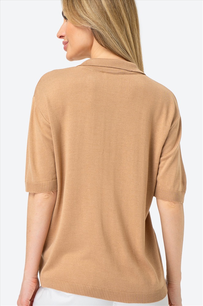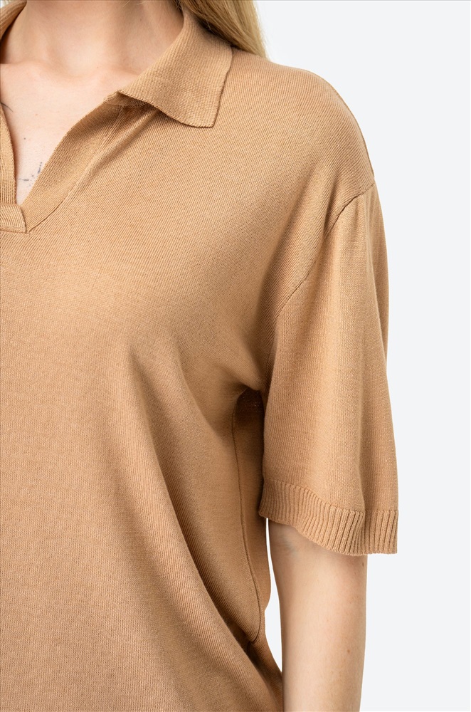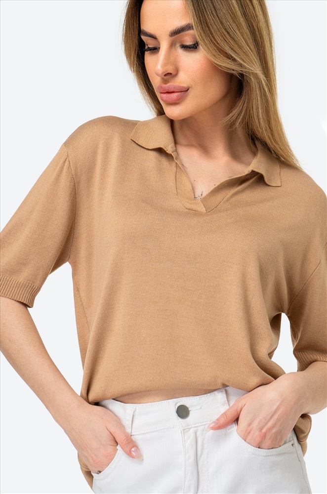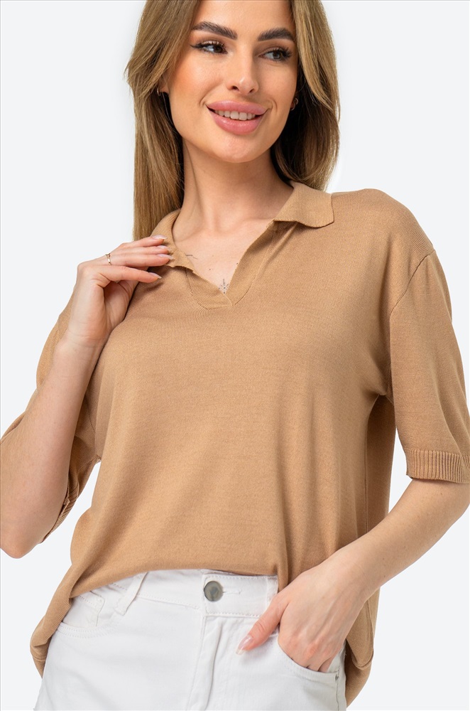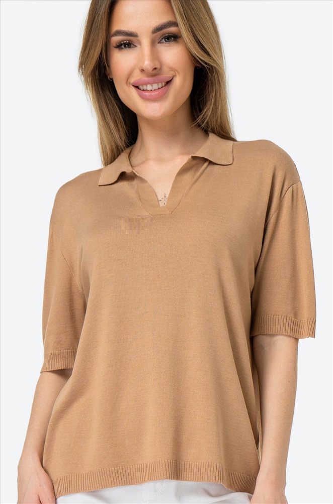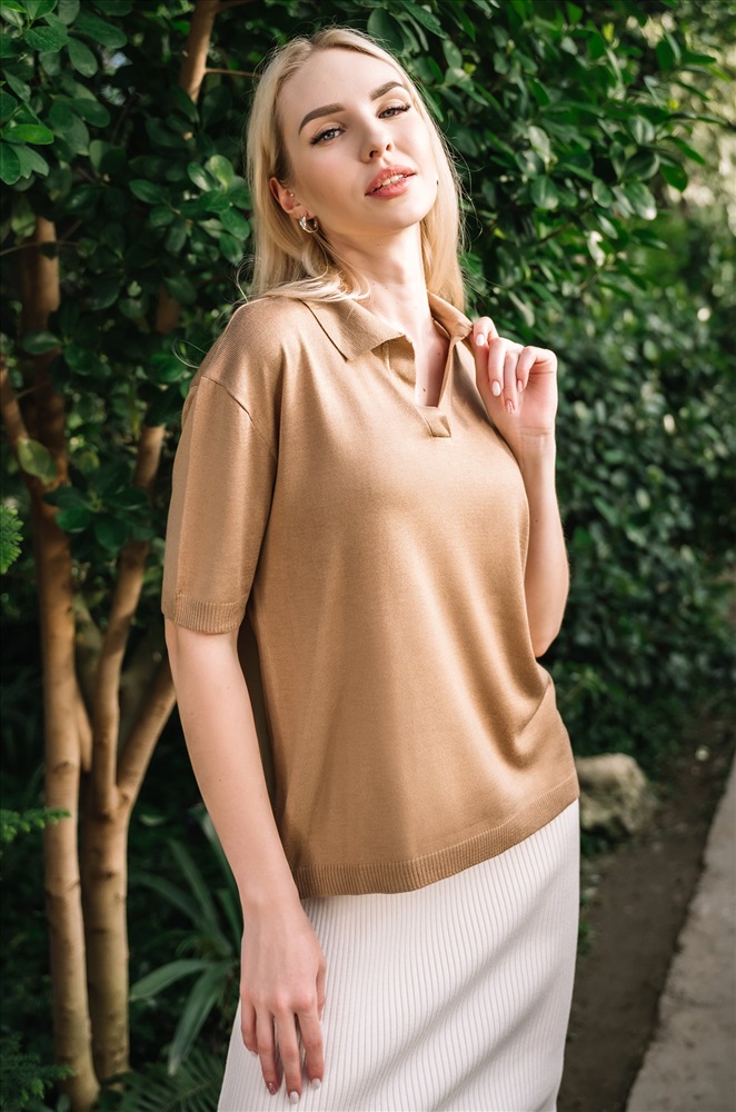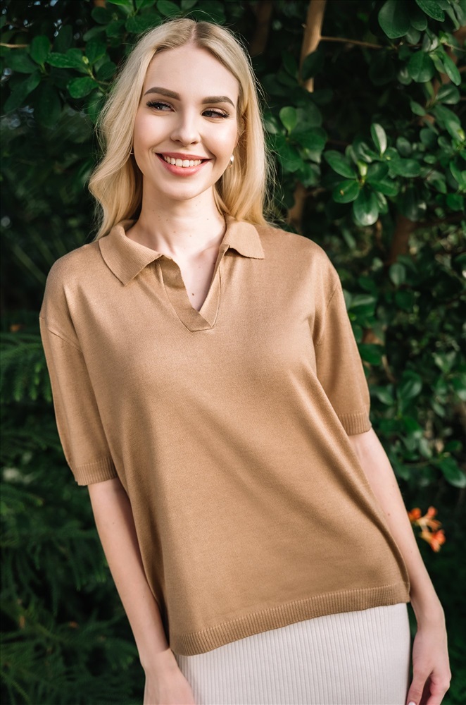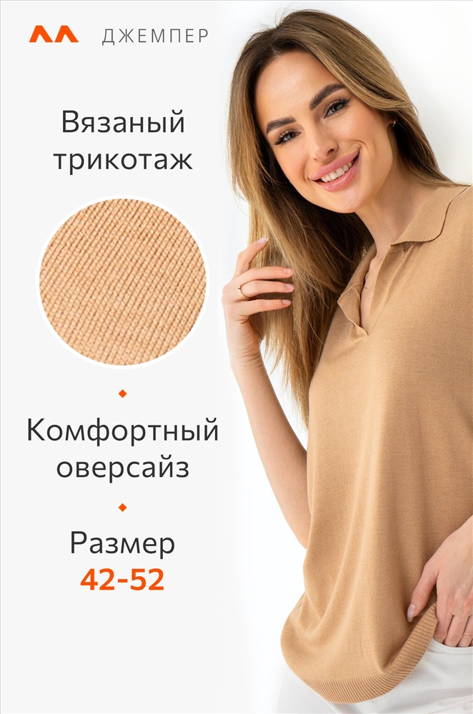 Почувствуй себя особенной! Женский джемпер поло выполнен из нежного вязаного трикотажа. Бежевый джемпер для женщин поможет создать крутой кэжуал образ для весны. Джемпер приковывает взгляды благодаря эффектному сочетанию волнующего V-образного выреза и лаконичного отложного воротника!