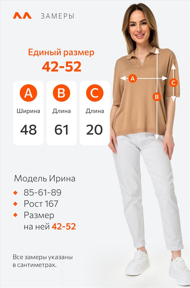 Модель Ирина, рост 167 см, параметры 85-61-89 см. На ней песочная тенниска единого размера 42-52.