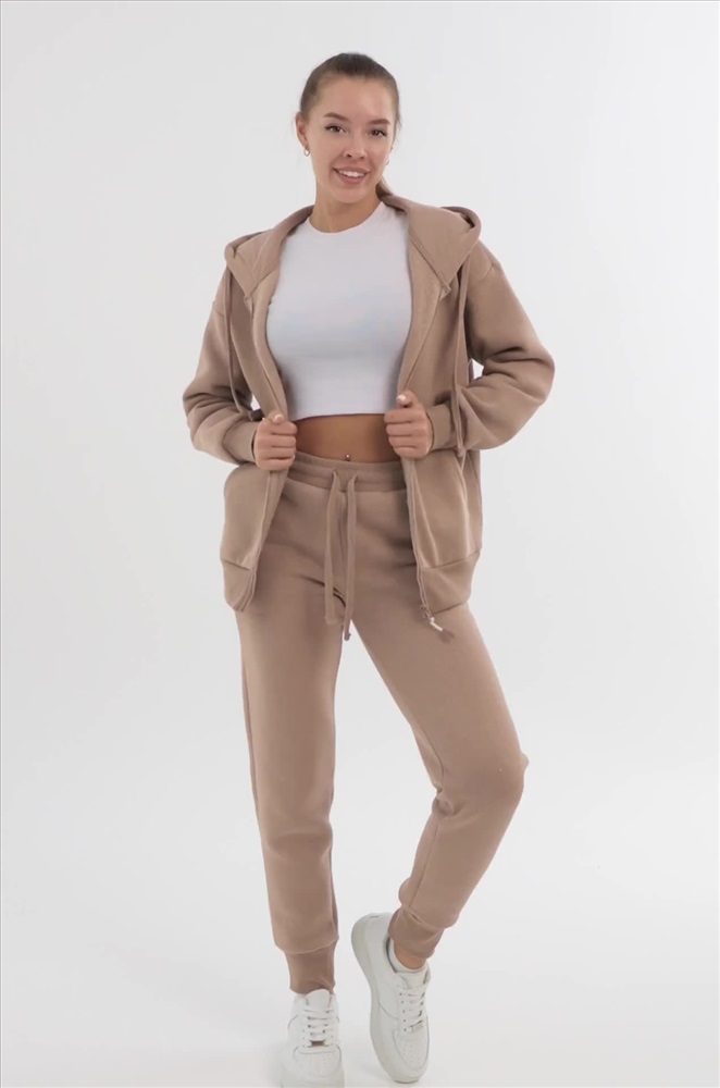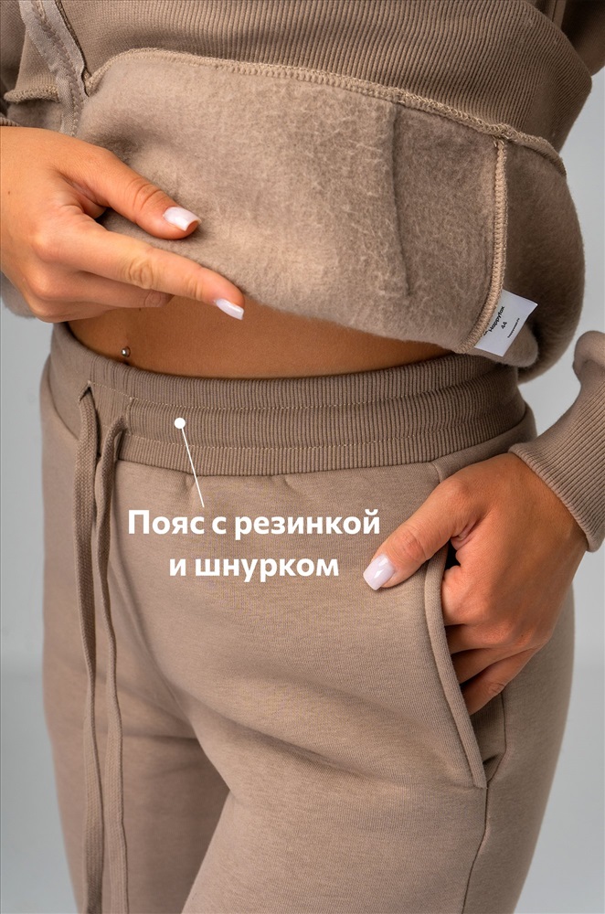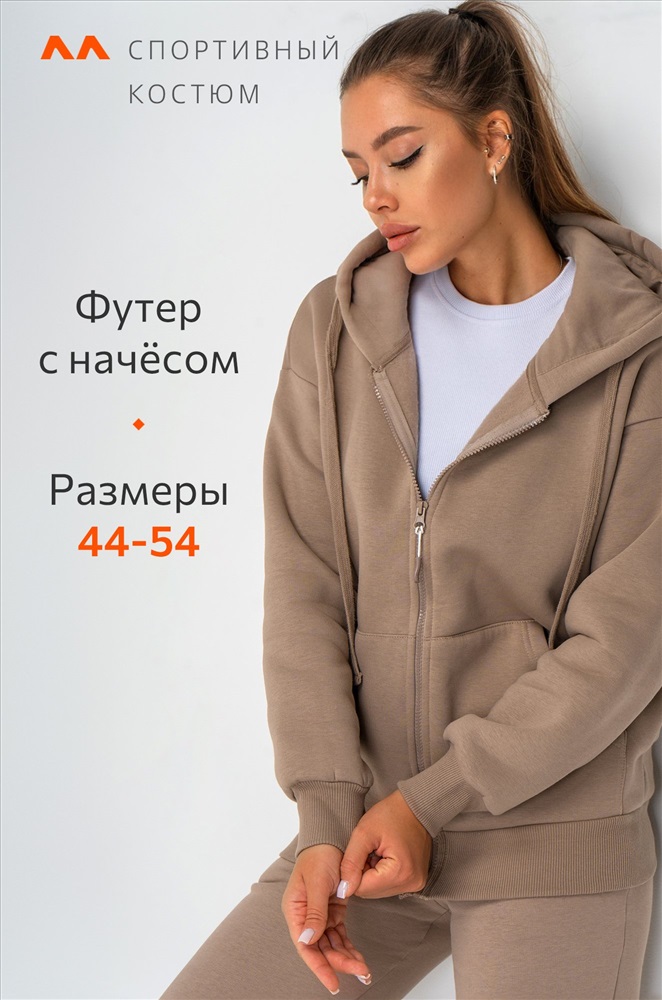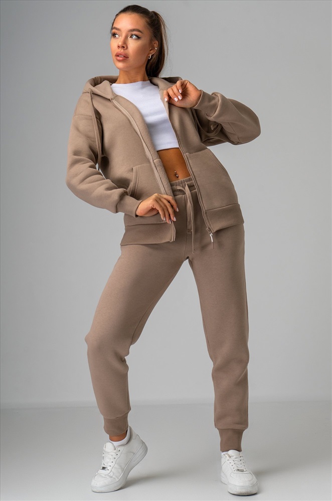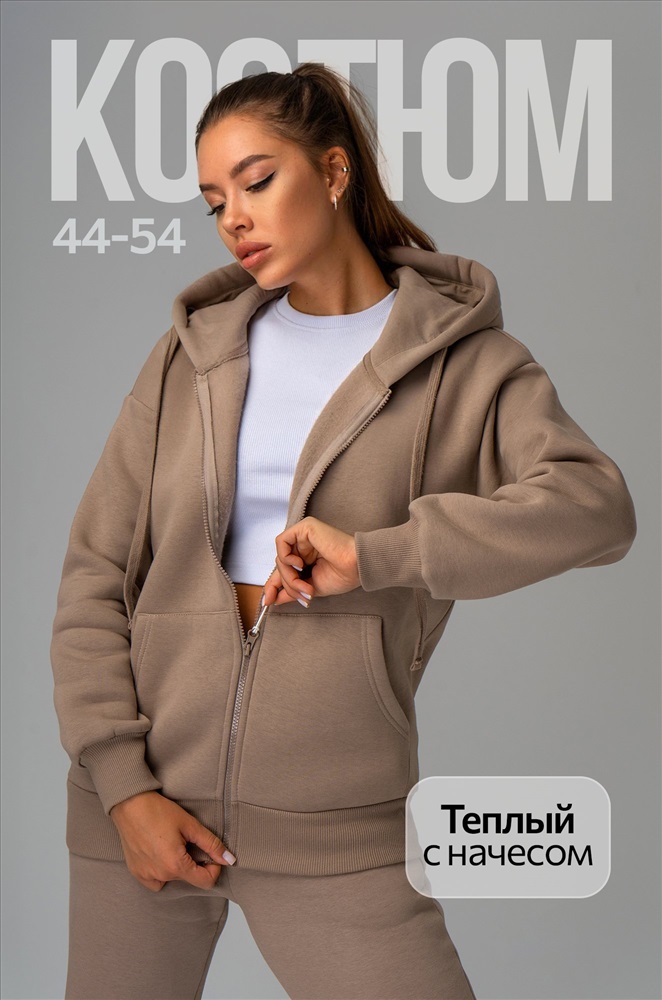 Женский теплый костюм с начесом — стильное и практичное решение для холодного времени года. В набор входят худи на молнии с капюшоном и удобные брюки-джоггеры.