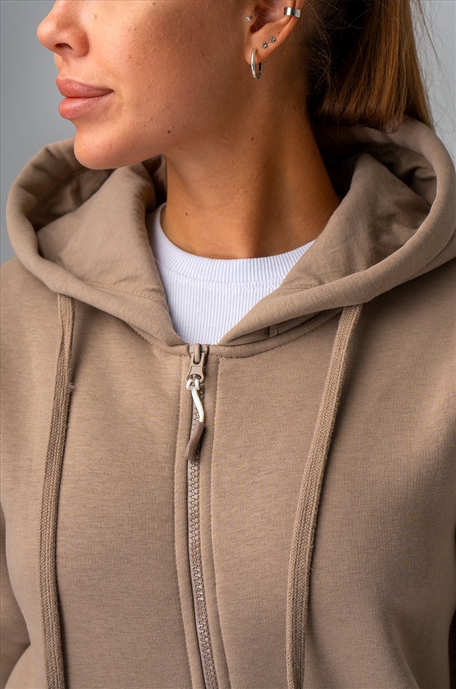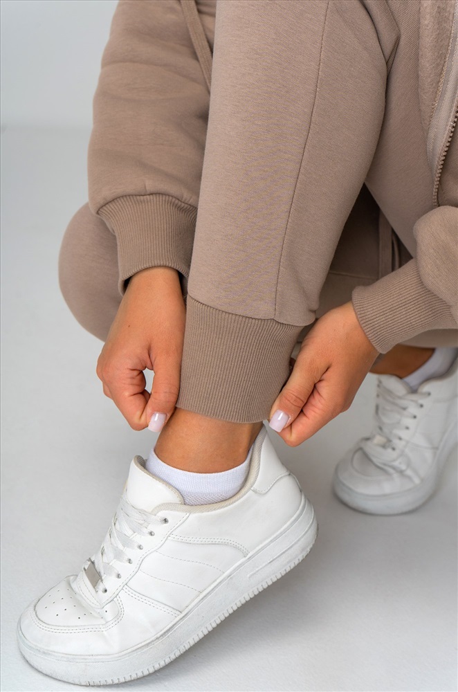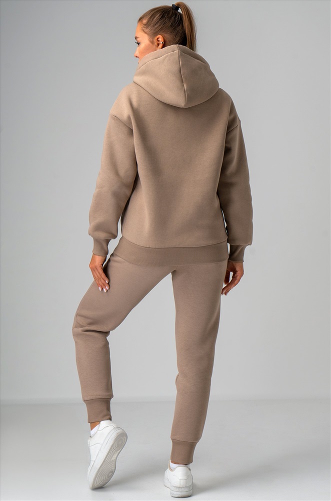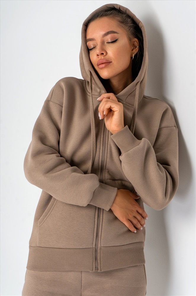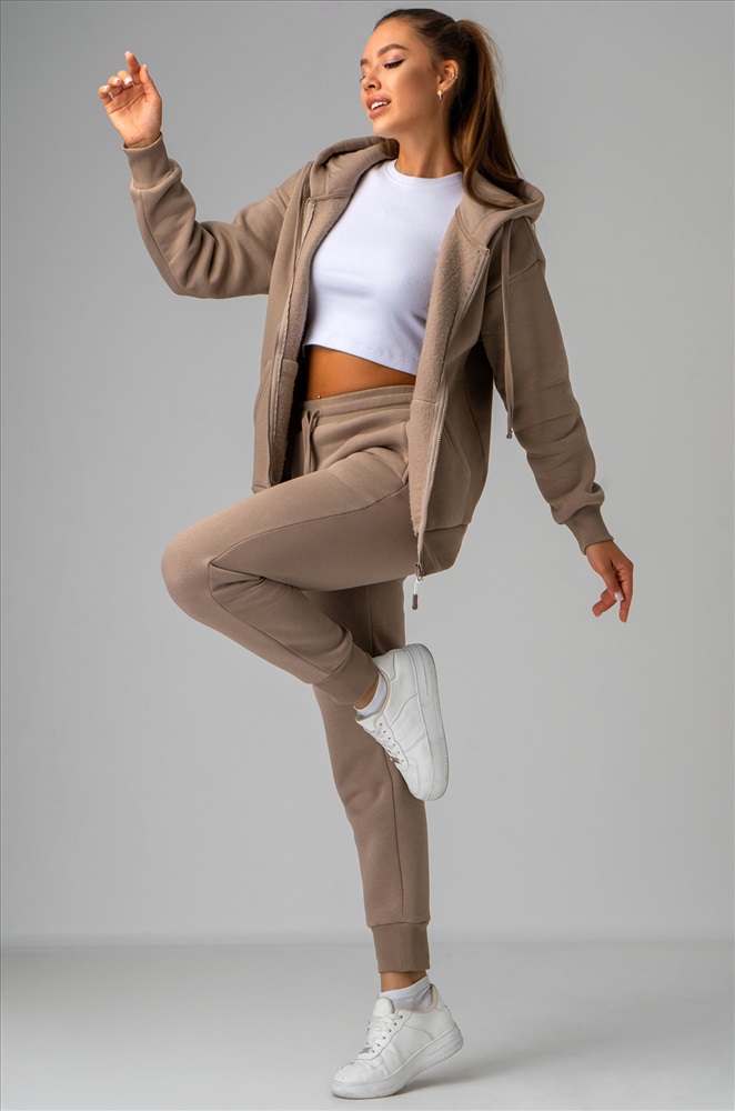 Женский теплый костюм с начесом — стильное и практичное решение для холодного времени года. В набор входят худи на молнии с капюшоном и удобные брюки-джоггеры.