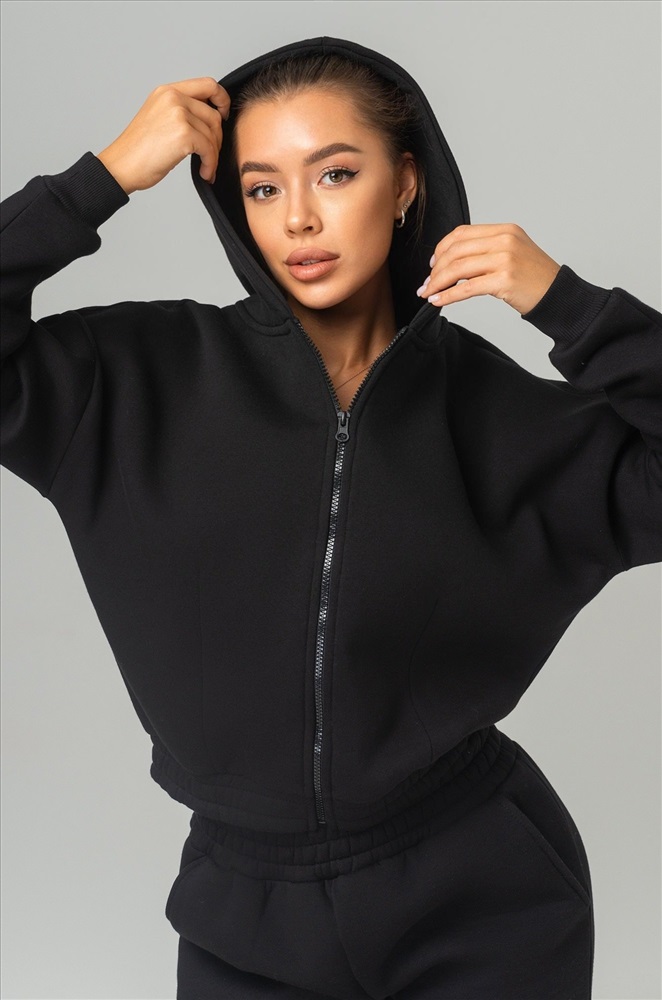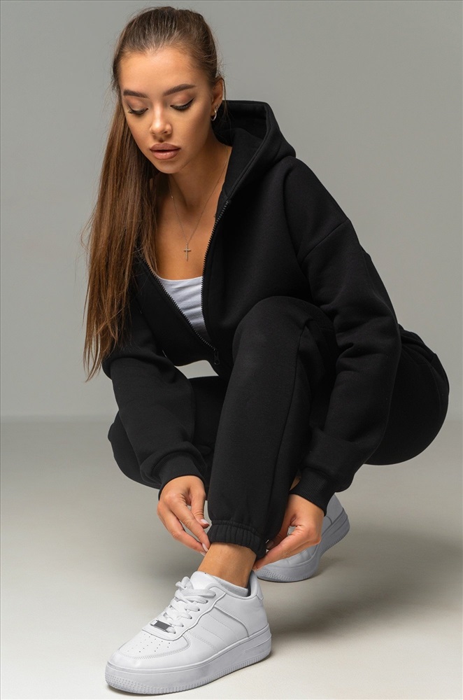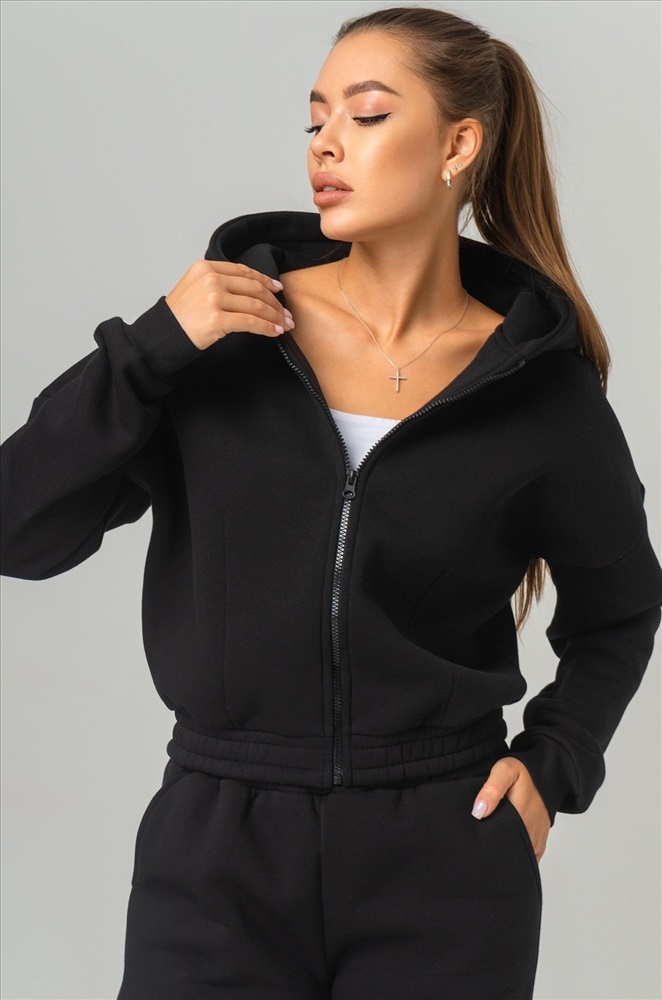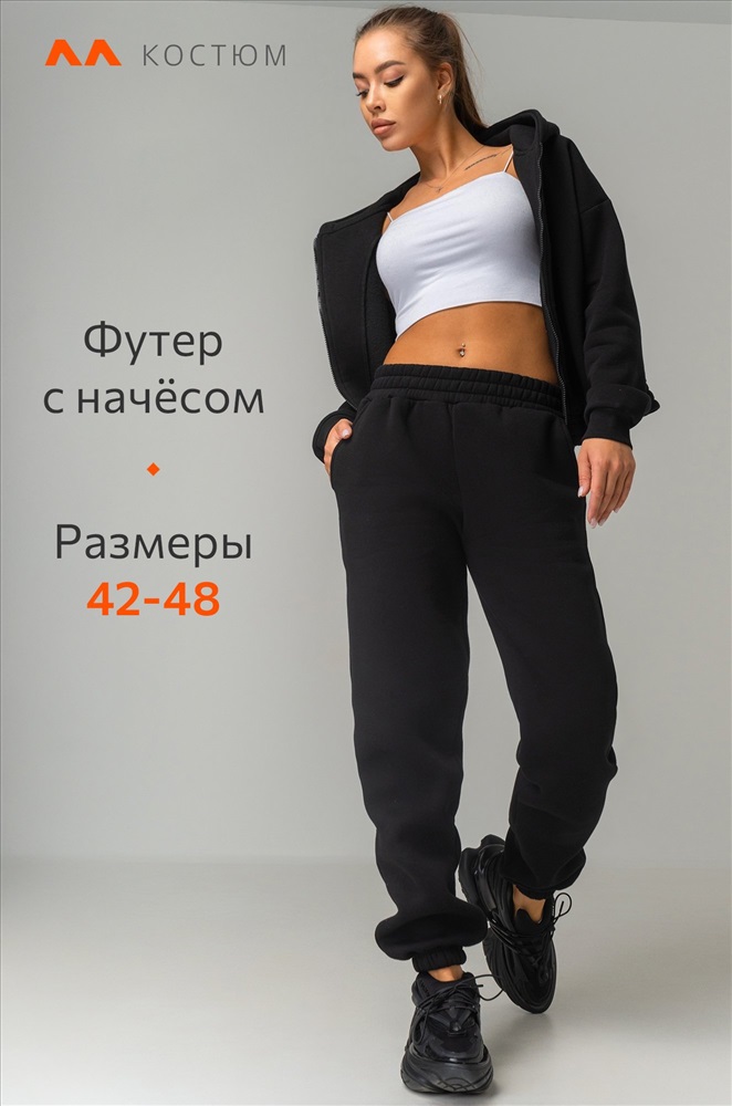 Преимущества: — утепленный костюм из футера с начесом надежно сохраняет тепло даже в холодную погоду; — спортивный костюм с укороченным худи оверсайз идеален на осень и зиму; — мягкие манжеты и эластичная резинка по низу обеспечивают комфортное прилегание; — штаны-джоггеры с высокой посадкой подчеркивают фигуру и не стесняют движения; — черный костюм из хлопка приятен к телу; — добавление полиэстера сохраняет форму и цвет после многократных стирок; — универсальный однотонный костюм подходит для прогулок, путешествий, поездок на природу и занятий спортом на свежем воздухе. Трикотажный костюм двойка для женщин незаменим для активного отдыха осенними и зимними днями.