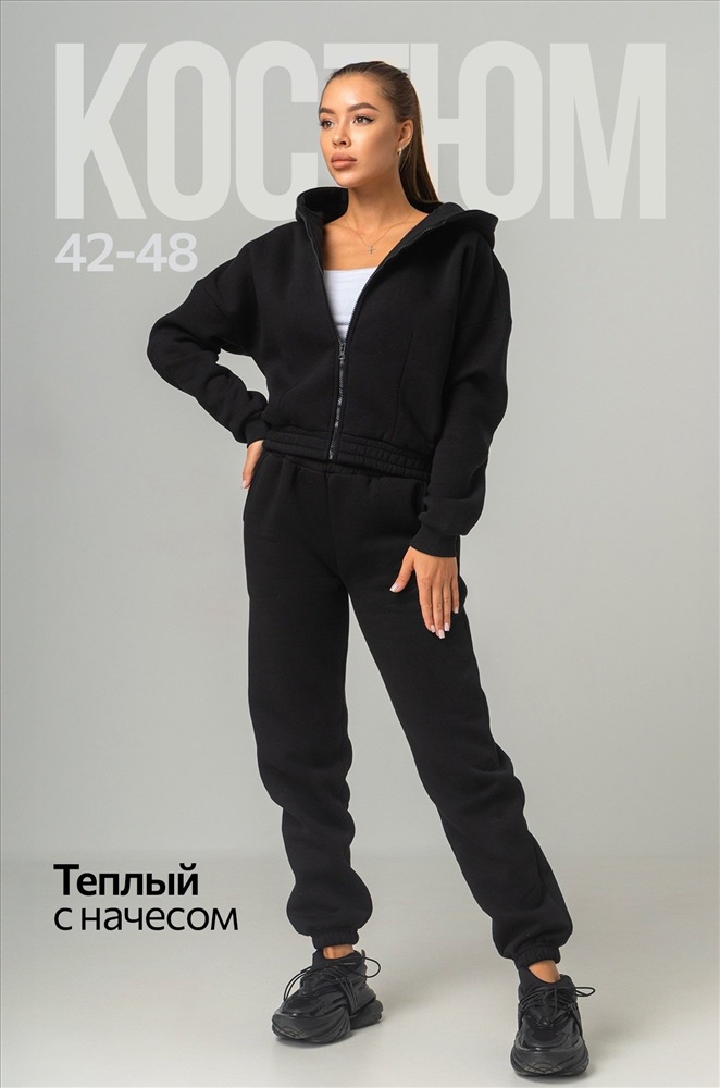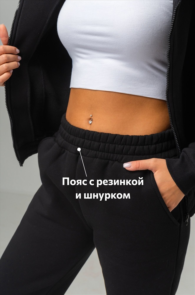 Женский теплый костюм с начесом — стильный и практичный выбор для прохладного сезона. В комплекте укороченная толстовка с капюшоном и удобные брюки-джоггеры с высокой посадкой.