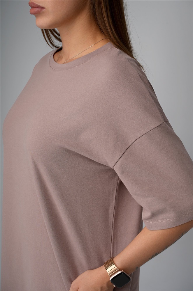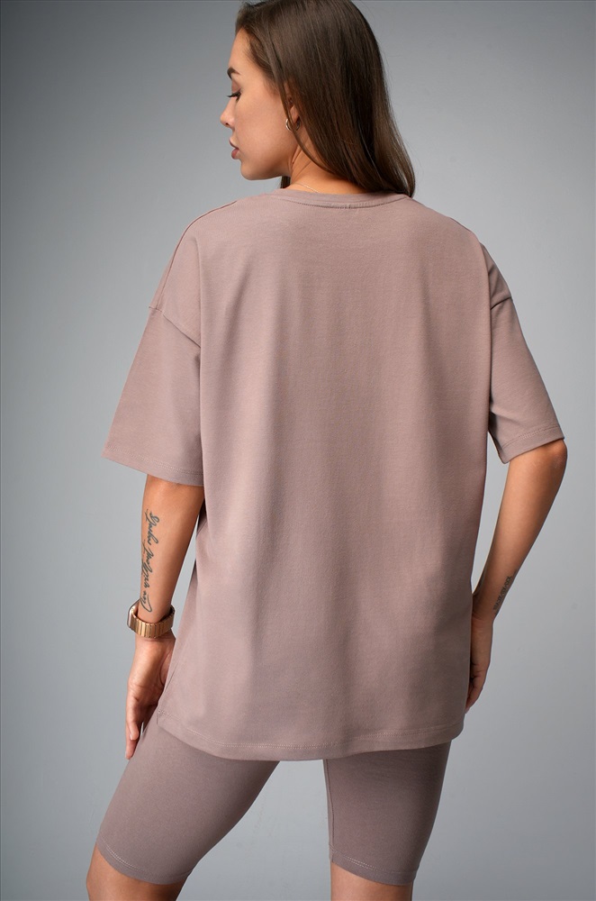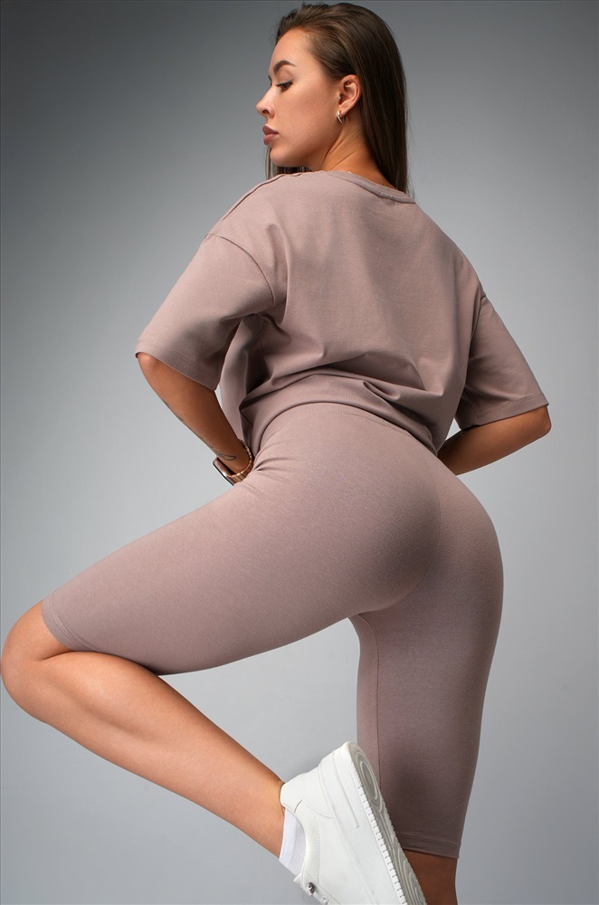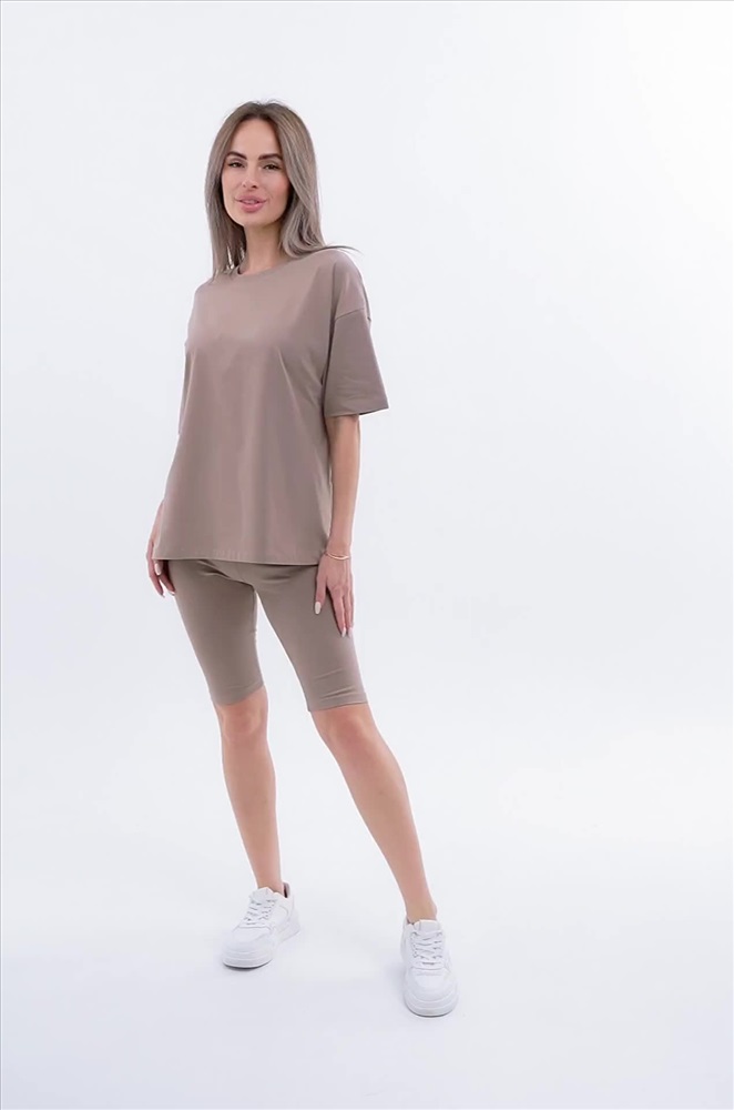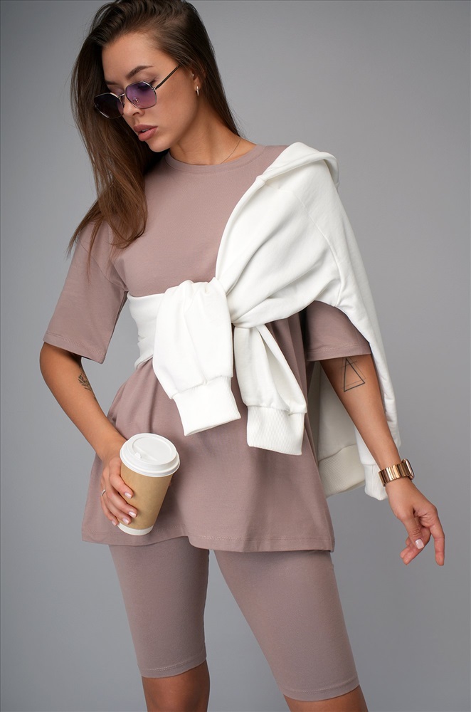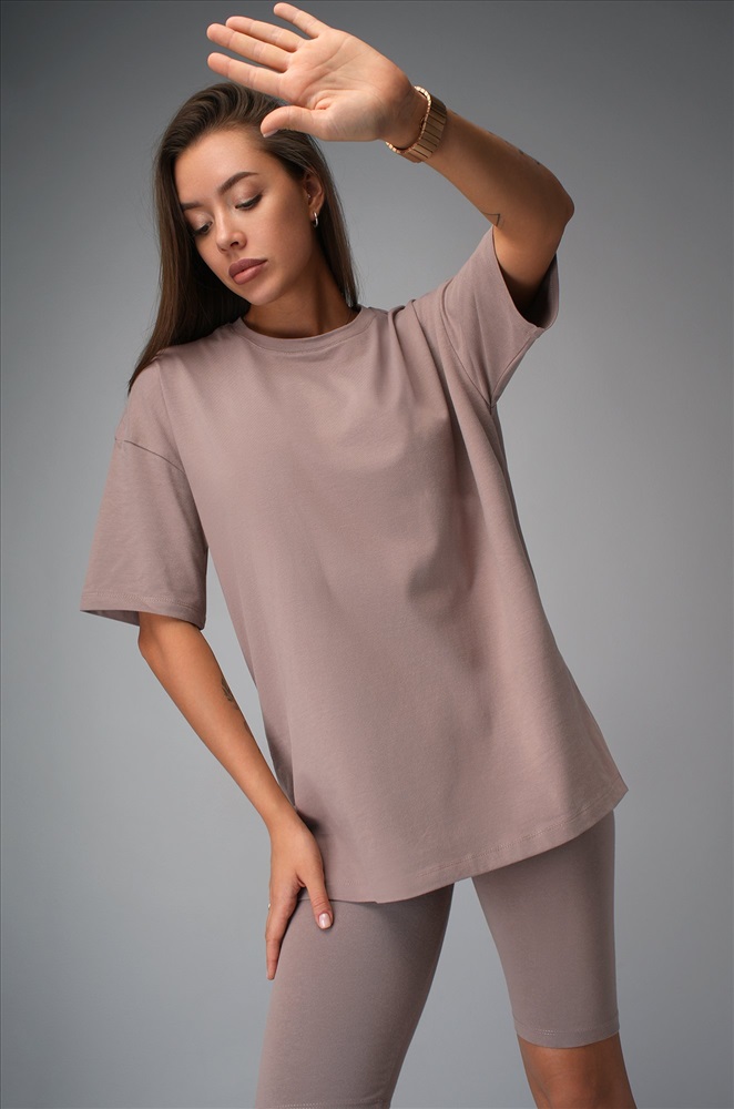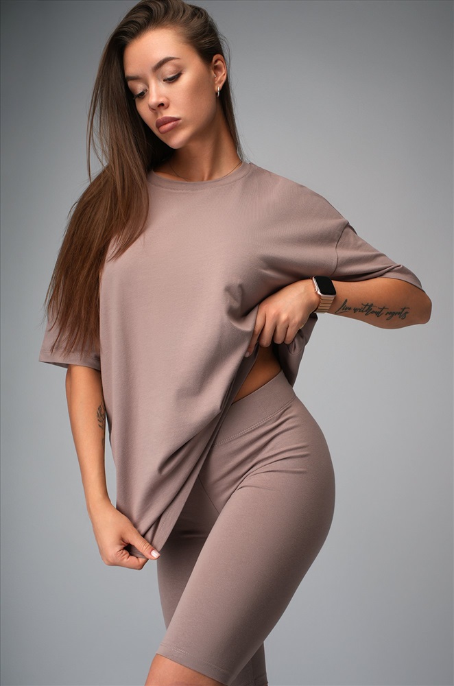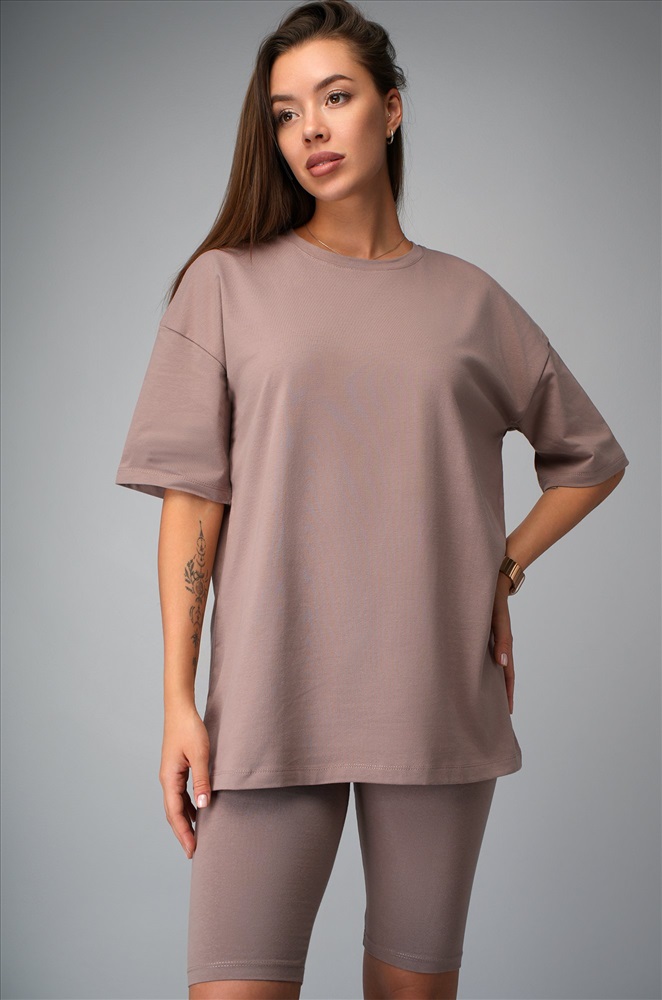 Футболка оверсайз (oversize) с заниженной линией плеча эффектно сочетается с облегающими шортами на широком эластичном поясе. Нежный цвет мокко придаёт образу элегантность и утончённость. Однотонный костюм для женщин идеально подойдет на каждый день. С ним получатся классные домашние образы и образы в стиле спорт кэжуал (sport casual).