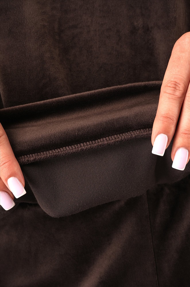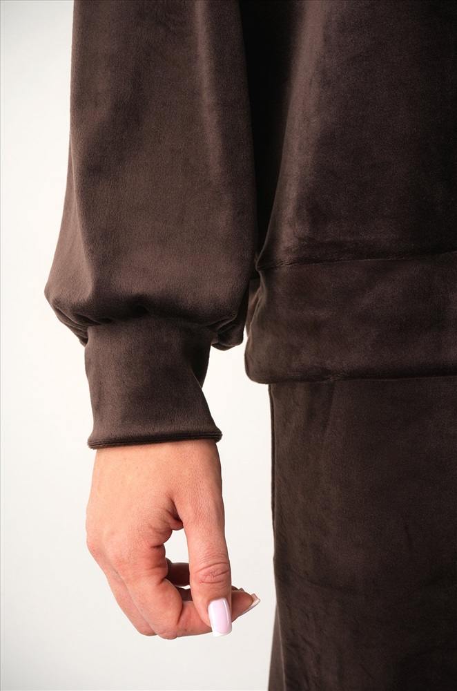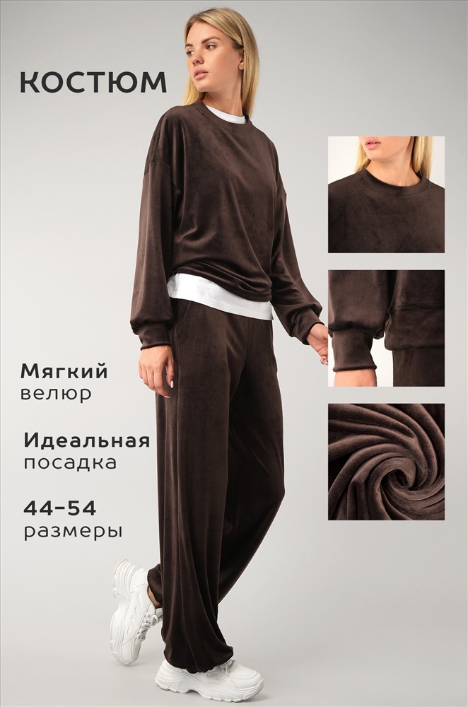 Женский костюм из мягкого велюра шоколадного цвета — идеальный выбор для тех, кто ценит комфорт и стиль. Однотонный костюм двойка согреет в прохладные дни осени и весны, а лаконичный дизайн подчеркнёт уверенность и вкус.