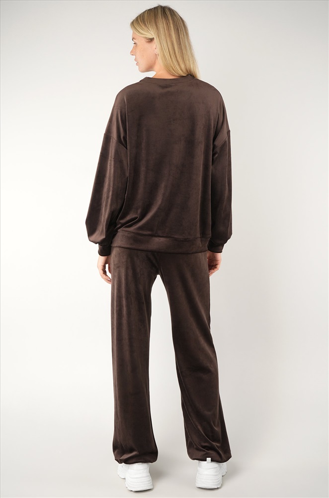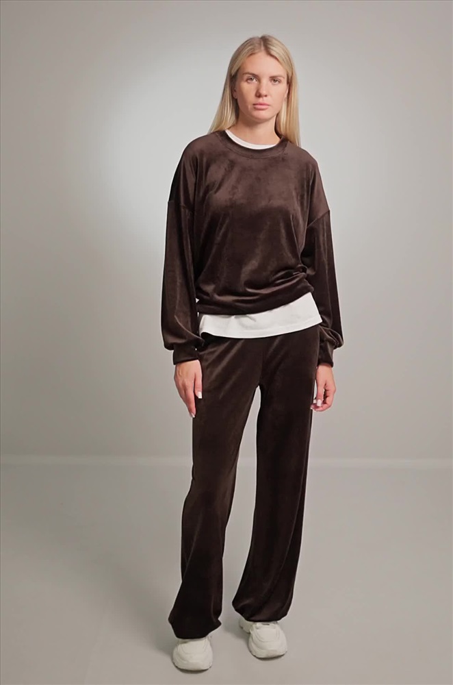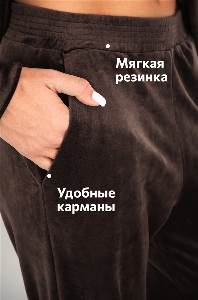 Повседневный велюровый костюм с брюками имеет свободный прямой крой и удобен для дома и прогулок. Бархатный костюм подойдет для путешествий и домашнего уюта. Коричневый костюм идеален для осенних и весенних образов.