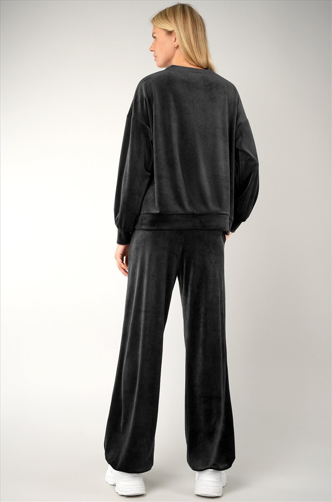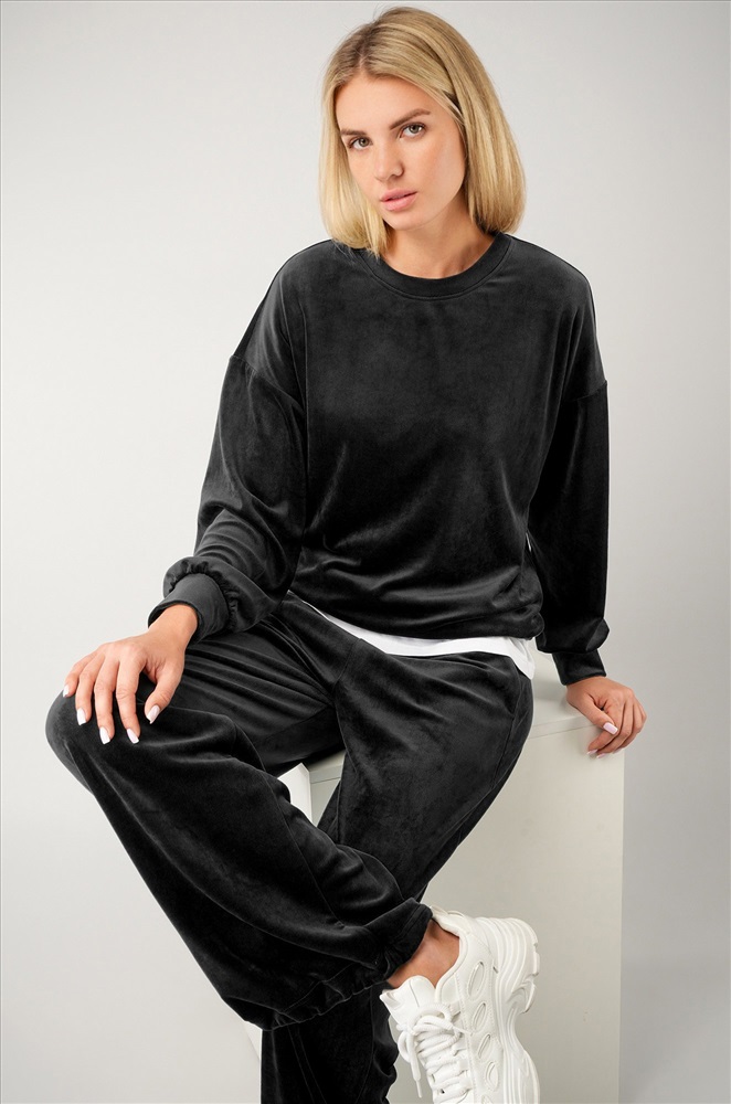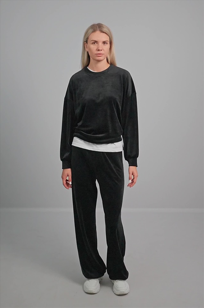 Женский костюм из мягкого велюра черного цвета — идеальный выбор для тех, кто ценит комфорт и стиль. Однотонный костюм двойка согреет в прохладные дни осени и весны, а лаконичный дизайн подчеркнёт уверенность и вкус.
