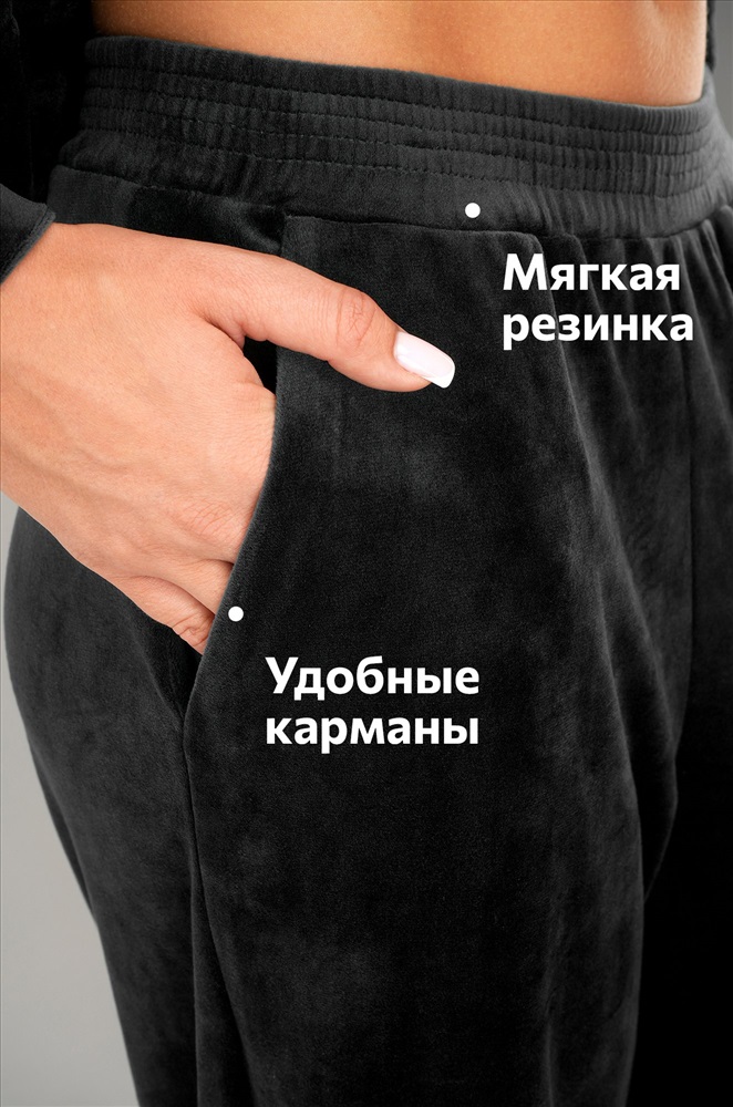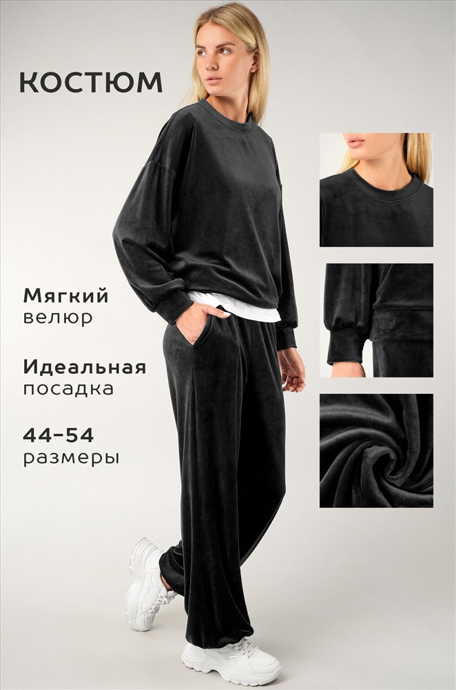 Преимущества: — велюровый костюм оверсайз подойдет на каждый день; — костюм с брюками выполнен из бархатного трикотажа с добавлением лайкры; — эластичный пояс и карманы для удобства; — костюм со штанами на резинке и утяжкой со стопперами по низу штанин смотрится стильно и расслабленно; — демисезонный трикотажный костюм — универсальный всесезонный вариант для женщин. Повседневный велюровый костюм с брюками имеет свободный прямой крой и удобен для дома и прогулок. Бархатный костюм подойдет для путешествий и домашнего уюта. Черный костюм идеален для спорта, осенних и весенних образов. Рост модели 177 см, параметры: объем груди 85, объем талии 66, объем бедер 90. На ней размер 44.