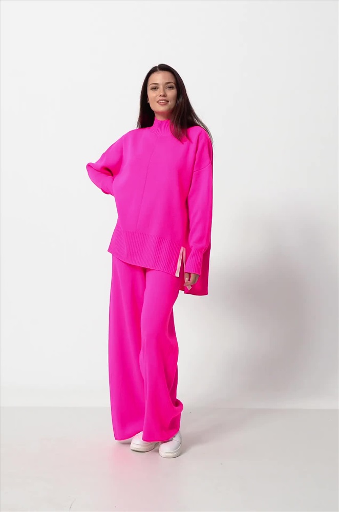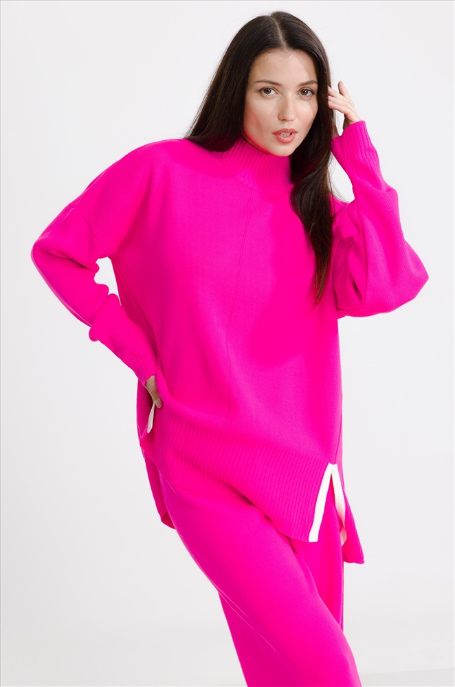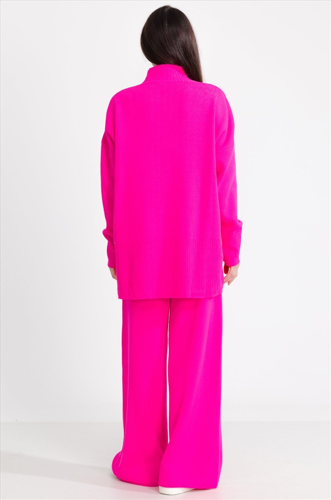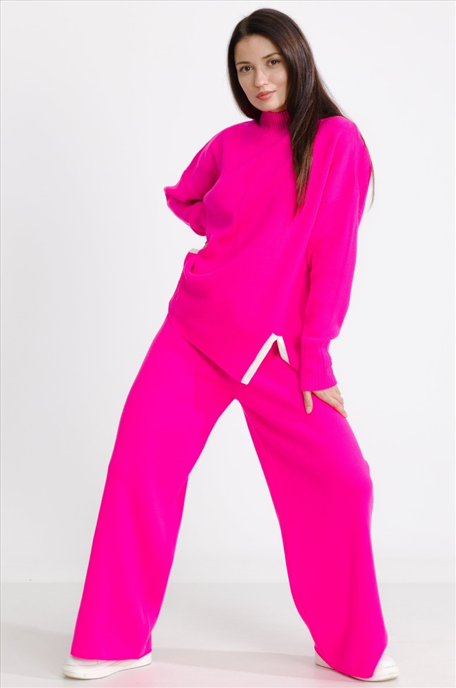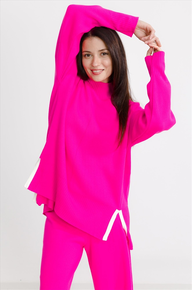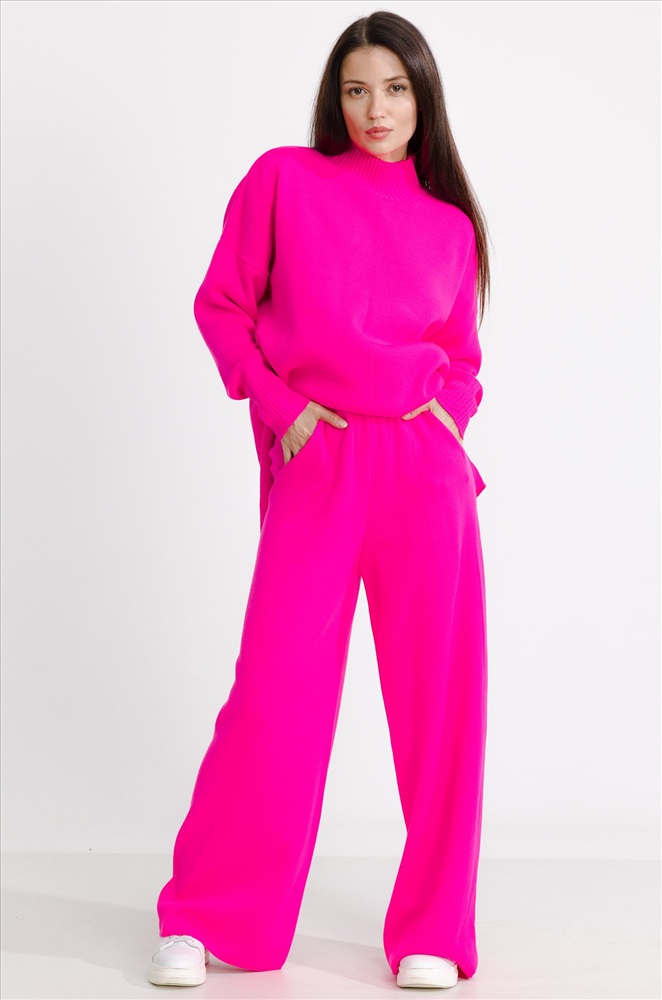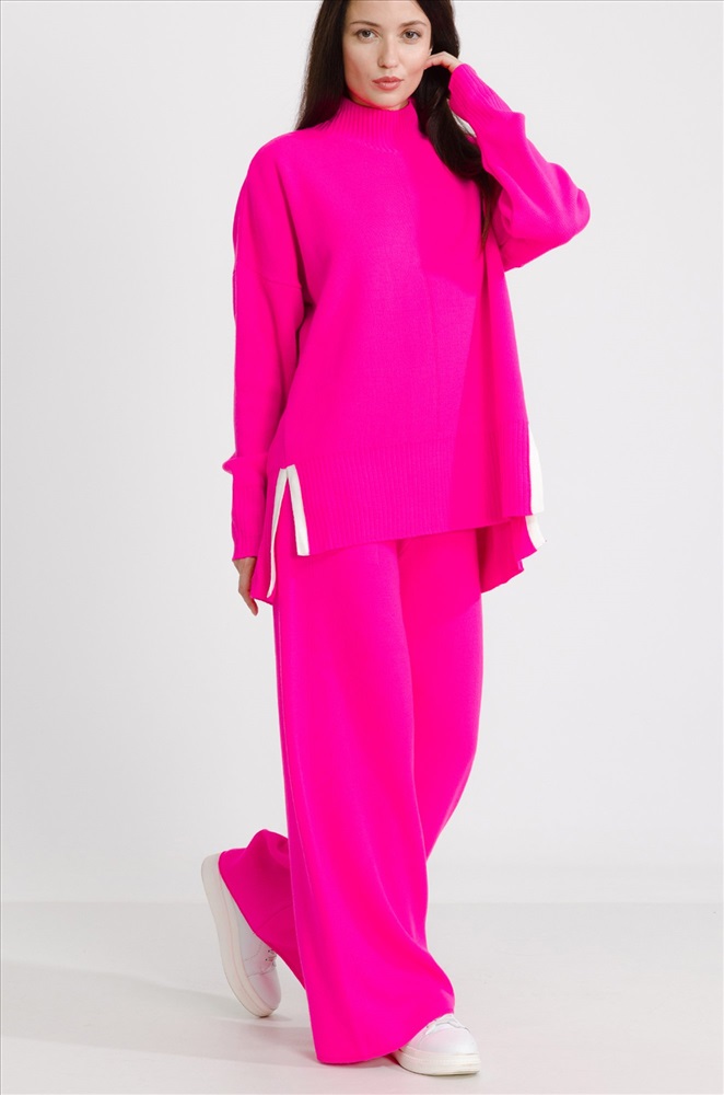 Женский костюм оверсайз с брюками позволит выглядеть женственно даже в холода. Теплый костюм oversize выполнен из приятного к телу вязаного хлопкового трикотажа, он прекрасно сохраняет тепло – идеальная база для прохладной осени и весны. В комплекте one size джемпер и прямые свободные брюки. Яркий малиновый костюм – сочетание элегантности и невероятного уюта. Полотно из хлопка с добавлением полиэстера позволяет джемперу и брюкам отлично тянуться, а плотная вязка сохраняет форму трикотажного костюма при частых стирках. Белая оборка на изящных разрезах и небольшой воротник стойка приковывают внимание к свитеру. Удлиненная нижняя часть джемпера, рукава и горловина выполнены фактурным плетением в рубчик – интересный и стильный акцент. Розовый костюм двойка поможет создать притягательный образ для любой ситуации. Демисезонный брючный костюм идеален для повседневных прогулок и похода на работу. Модель Лера, ее рост 167 см, параметры 85-61-88. На ней костюм единого размера 42-52.