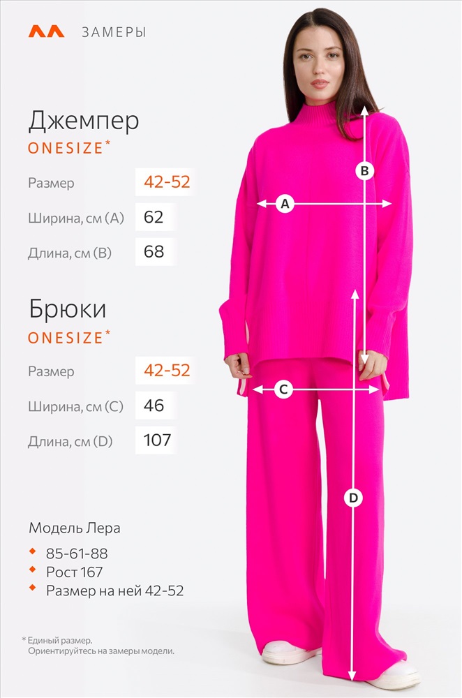 джемпер: длина:68 см; ширина:62 см. брюки: длина внеш.шва:107 см; длина внутр.шва:72 см; ширина по бедрам:46 см. *замеры выборочные, могут незначительно отличаться. Комментарии к товару
