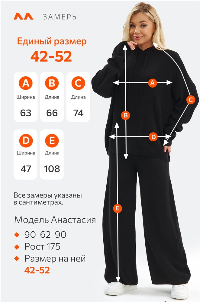 Женский костюм из вязаного трикотажа черного цвета — идеальный выбор для стильных и уверенных в себе леди. В комплекте джемпер с капюшоном и брюки палаццо на резинке.