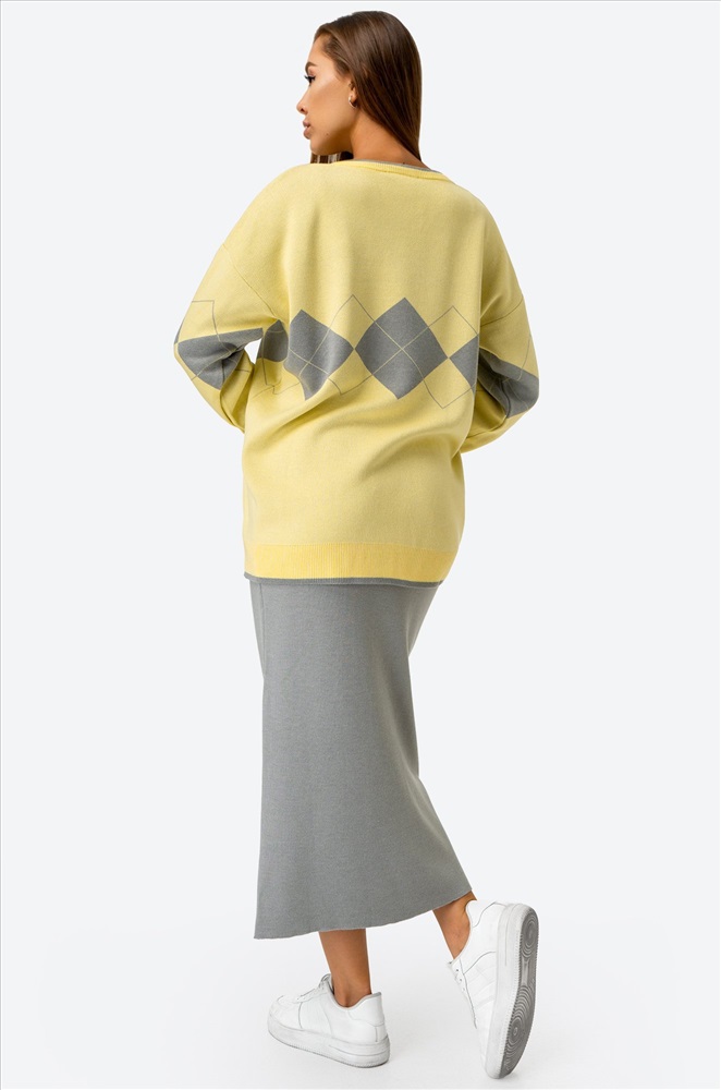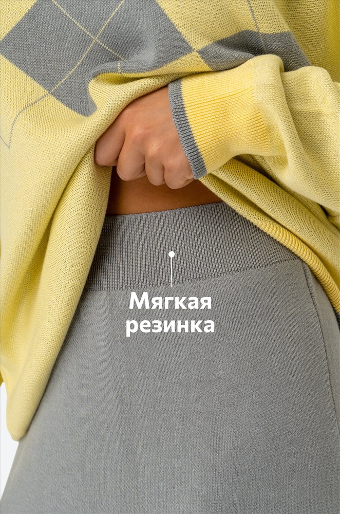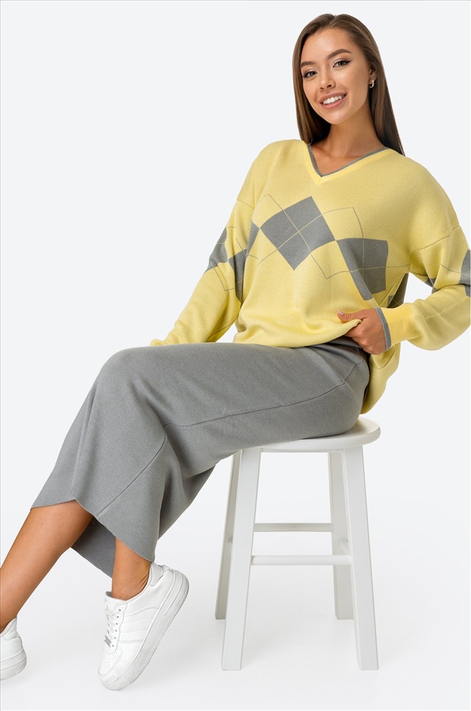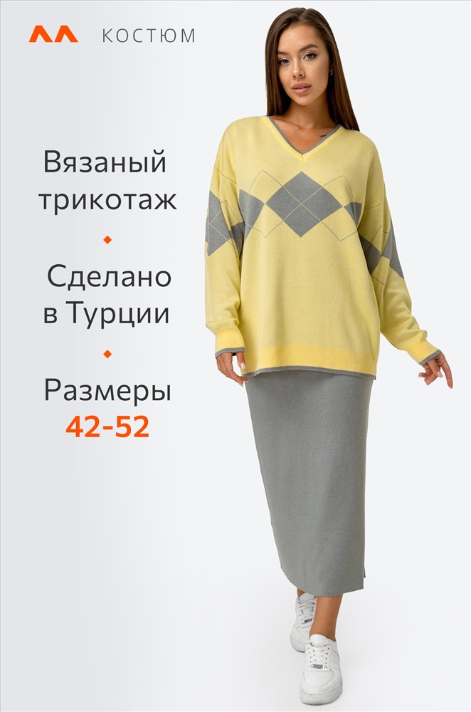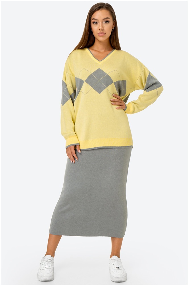 Вы не останетесь незамеченной! Этот привлекательный женский комплект из вязаного трикотажа — настоящая находка для прекрасных дам. Он сочетает в себе изысканность серого и свежесть желтого, создавая утонченный образ. Костюм состоит из джемпера со спущенным плечом и юбки на резинке.