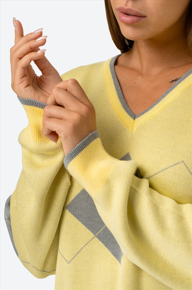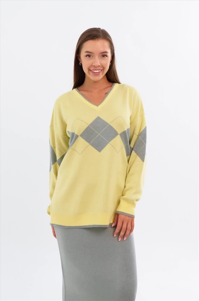 Прямой крой юбки и длина миди придают ей элегантность и позволяют подчеркнуть женственные формы, а джемпер с V-образным вырезом горловины и рисунком в виде ромбов добавляет игривости и, одновременно, классической строгости. Длинные рукава джемпера делают его универсальным вариантом для весны и осени.