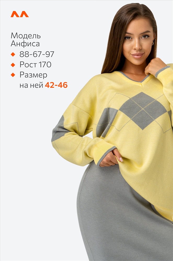 Модель Анфиса, рост 170 см, параметры 88-67-97 см. На ней костюм с юбкой размера 42-46.