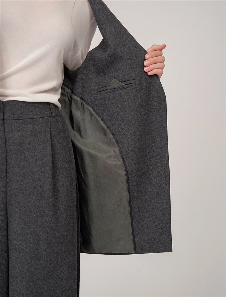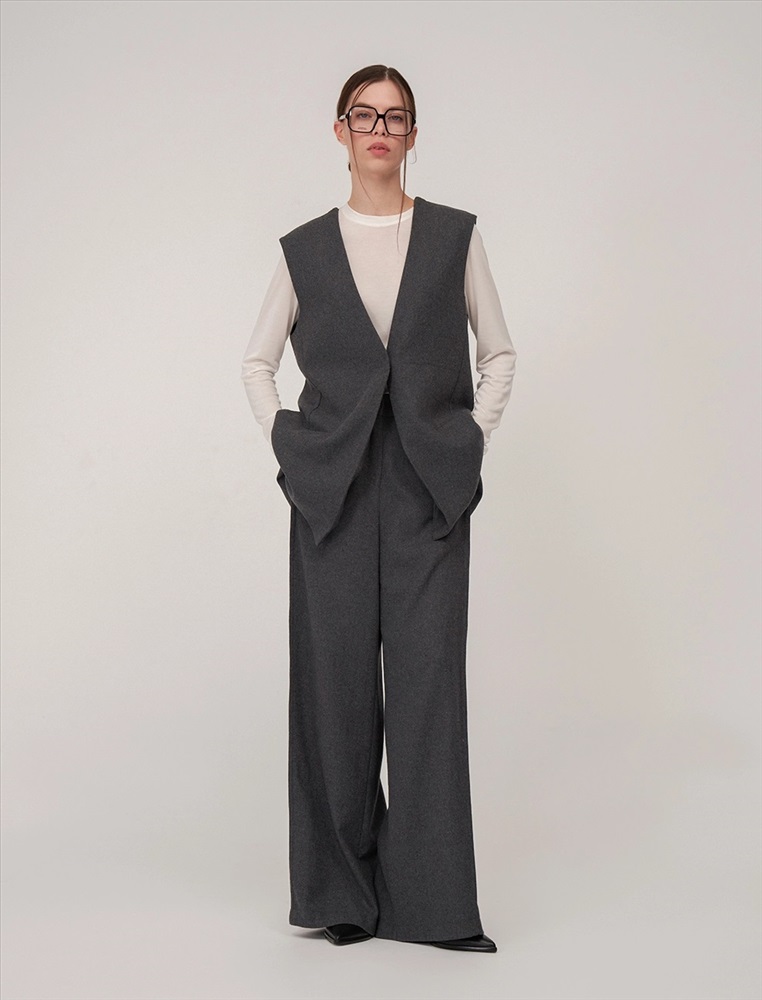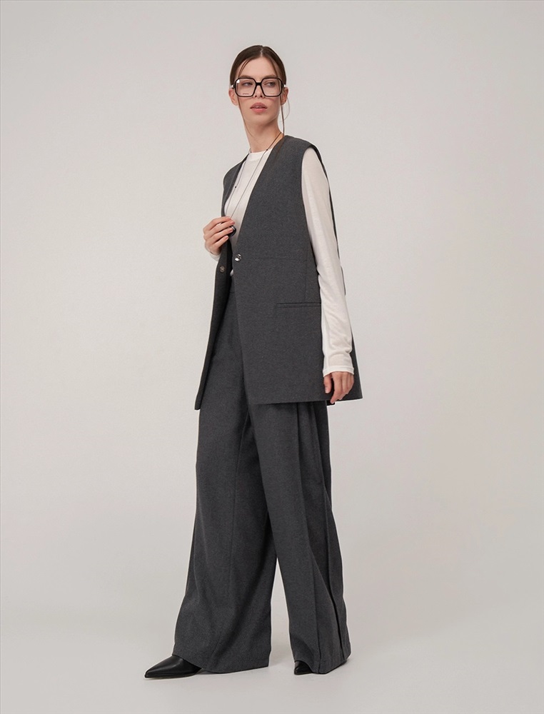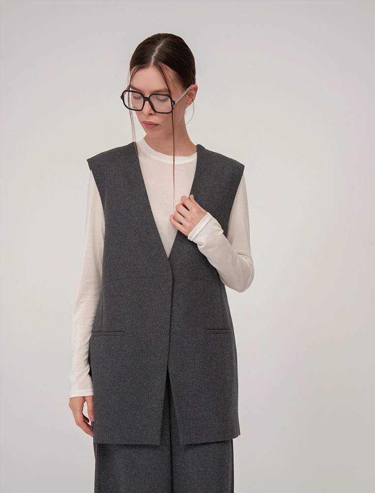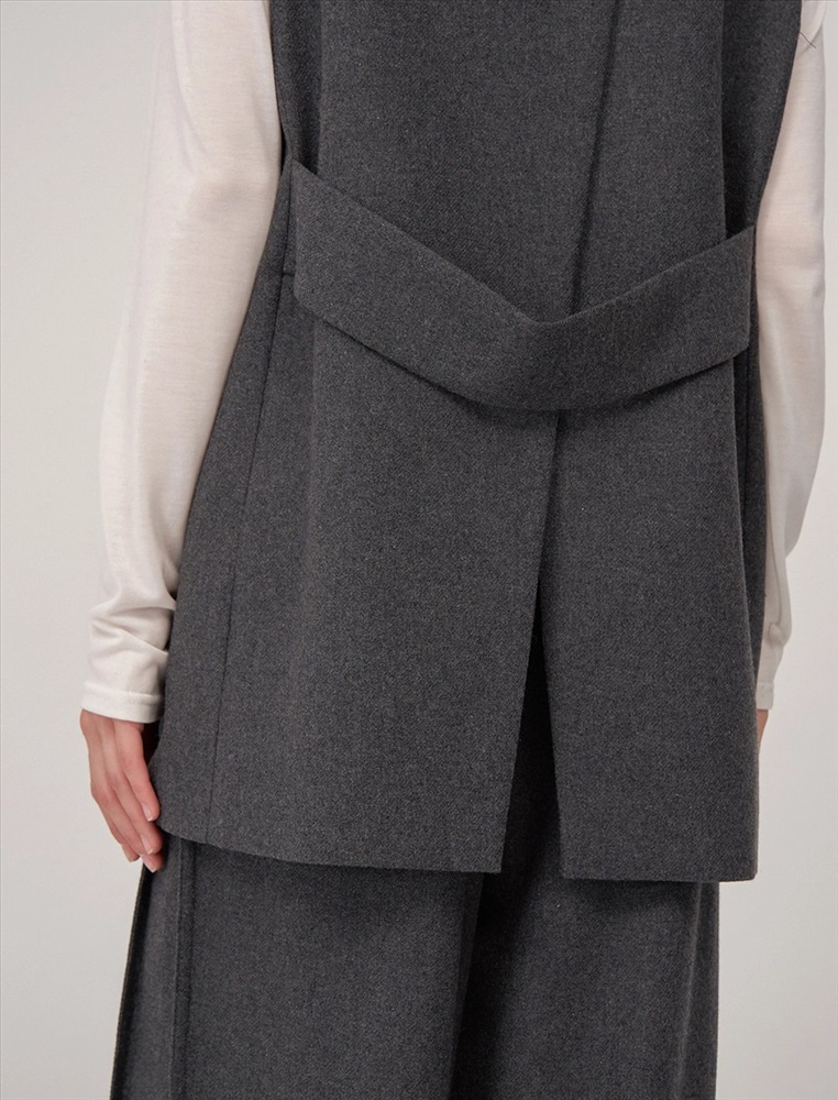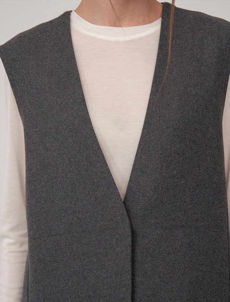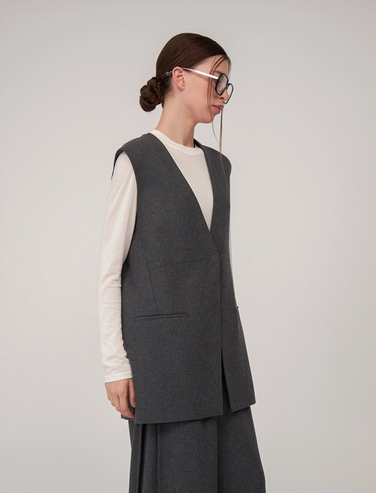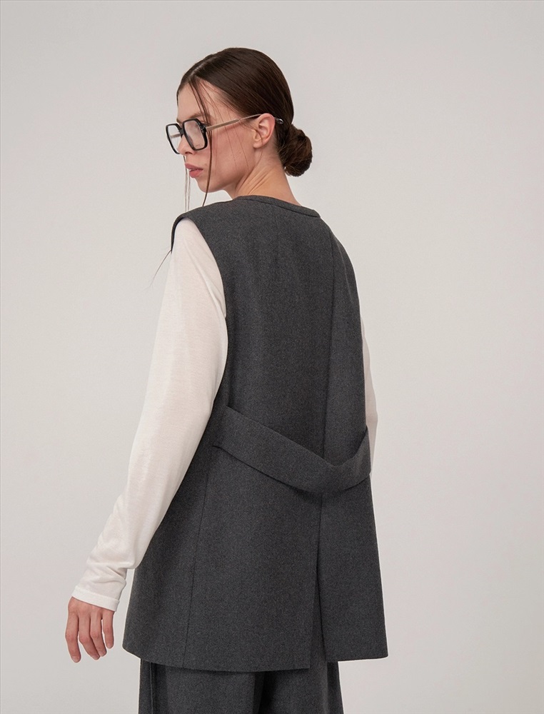 Жилет прямого силуэта без рукавов. Длина до уровня ниже бедра. По передней части рельефные швы, застежка на кнопку и карманы с листочкой. Горловина имеет V-образную форму. Сзади запах и широкий хлястик. Ткань верха выполнена из шерсти, вискозы и полиэстера, которые обеспечивают тепло, долговечность и комфорт. Подкладка выполнена из полиэстера.