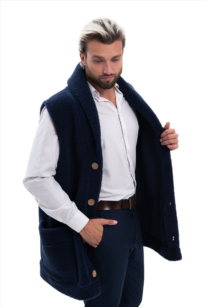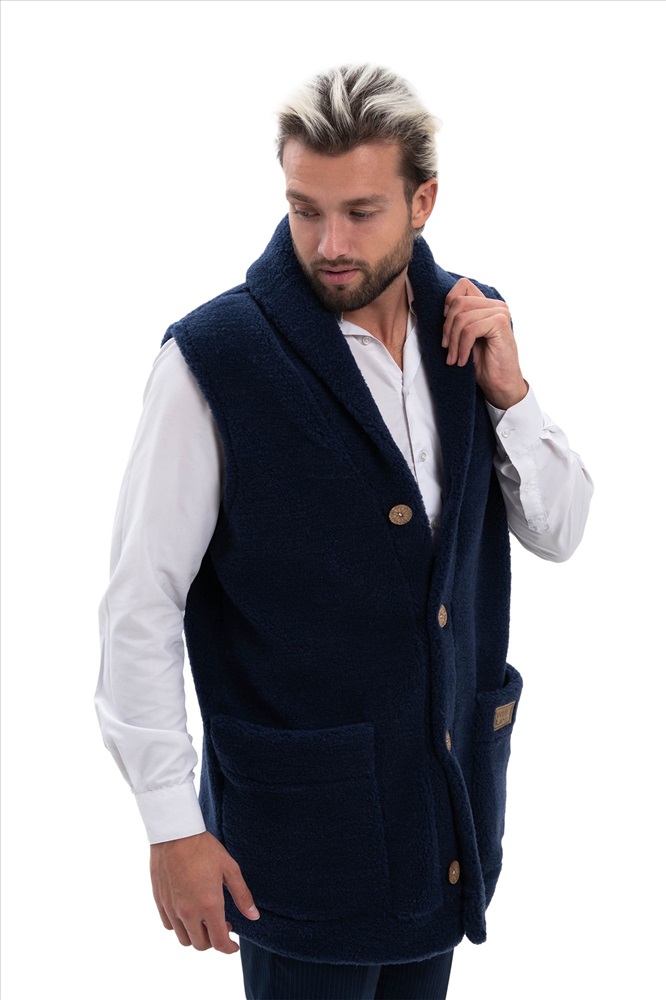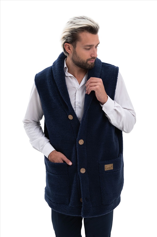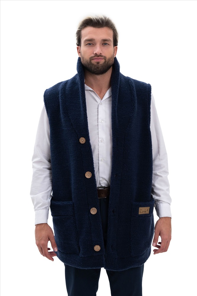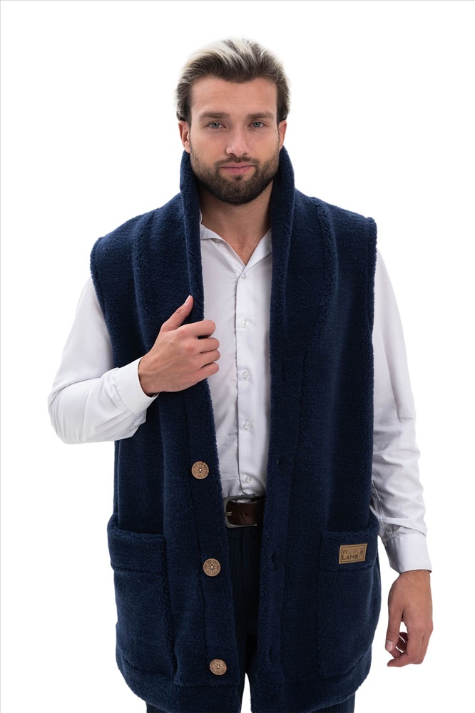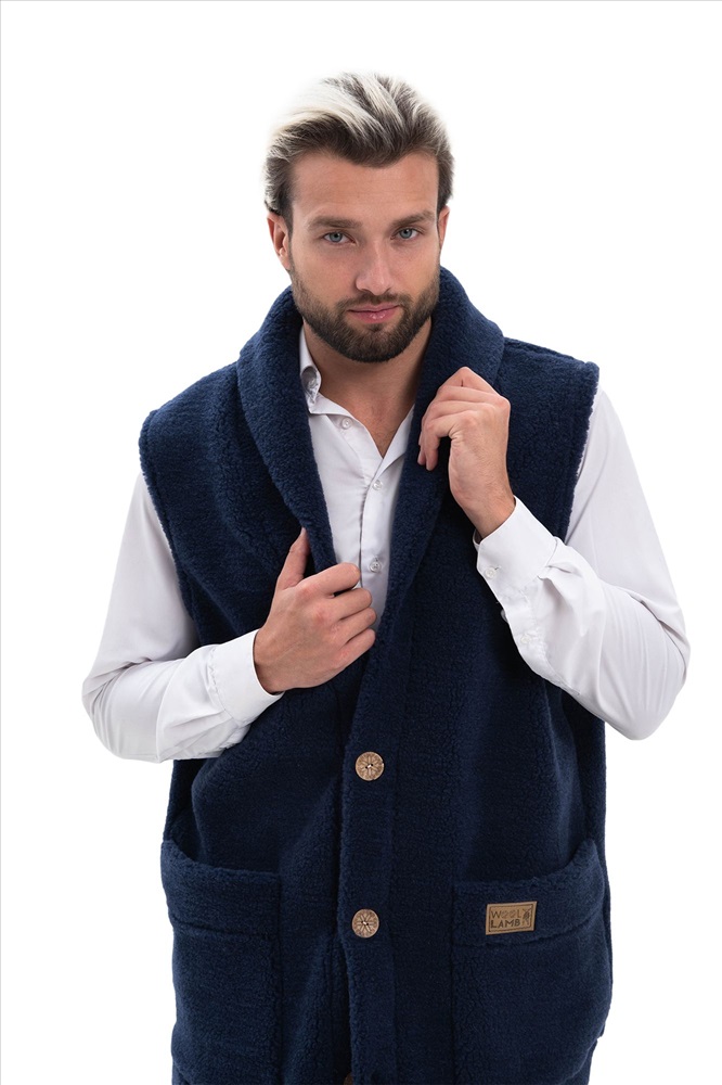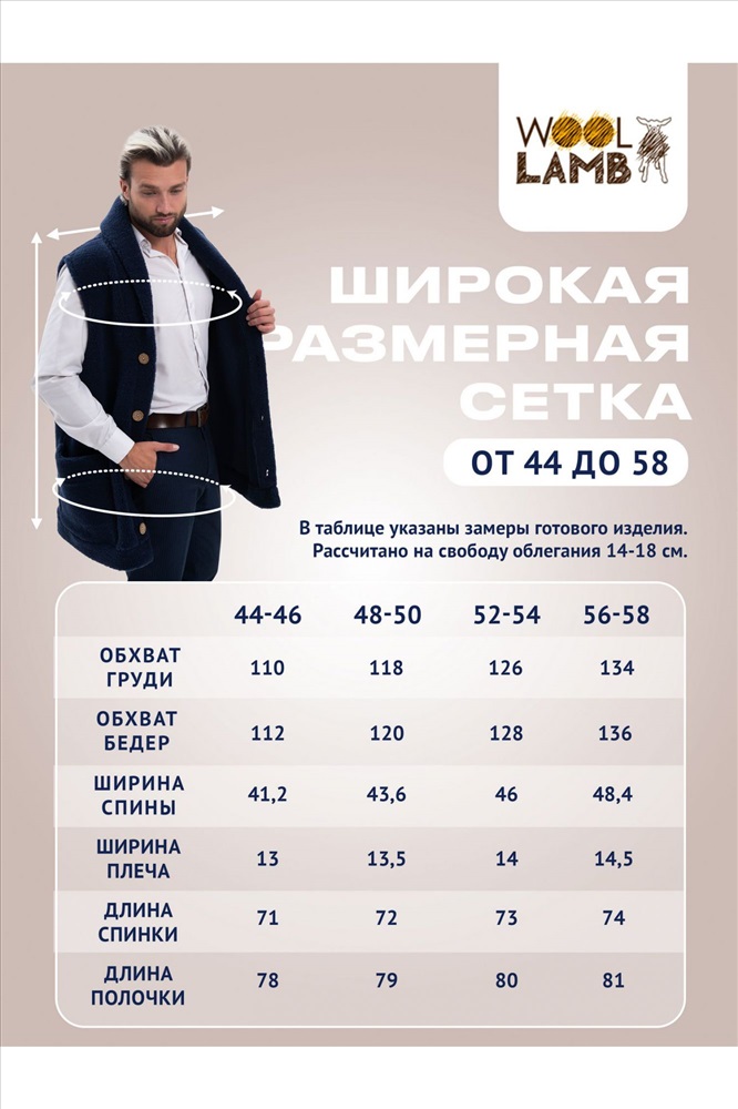 В таблице размеров указаны замеры готового изделия. Рассчитано на свободу облегания 14-18 см., Мужской жилет меховой с воротником на пуговицах из натуральной шерсти. Высота ворса 7 мм, без подкладки. Мягкий, теплый, комфортный, прямого силуэта.  Жилет можно использовать как верхний и средний слой одежды, для улицы, дома и офиса!, Удобные накладные карманы, застежка пуговицы, качественный пошив, хорошие лекала и современные расцветки сделают ваш образ максимально комфортным и стильным., Наши изделия созданы из новейшего, уникального, разработанного специально для нас, материала на основе овечьей шерсти. Невероятно мягкий, легкий, пластичный он подарит тепло и комфорт своей обладательнице. Стильный фасон отвечает всем современным тенденциям моды!, Все наши лекала уникальны и не имеют аналогов, разработаны на собственном швейном производстве фабрики WOOLLAMB, это обеспечивает отличную посадку и комфортное использование для любой фигуры., Примерная температура носки от -10 до +20 градусов, Благодаря высокому содержанию ланолина, шерсть обладает высокими оздоравливающими и согревающими свойствами, благоприятно влияет на весь организм в целом! Одежда из натуральной шерсти подарит легкость, комфорт и сухое тепло рожденное природой!, Уход за изделиями максимально прост, стирка ручная со средствами для шерсти, или сухая химчистка, при необходимости можно отпарить паровым утюгом.