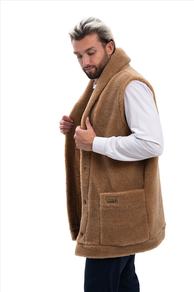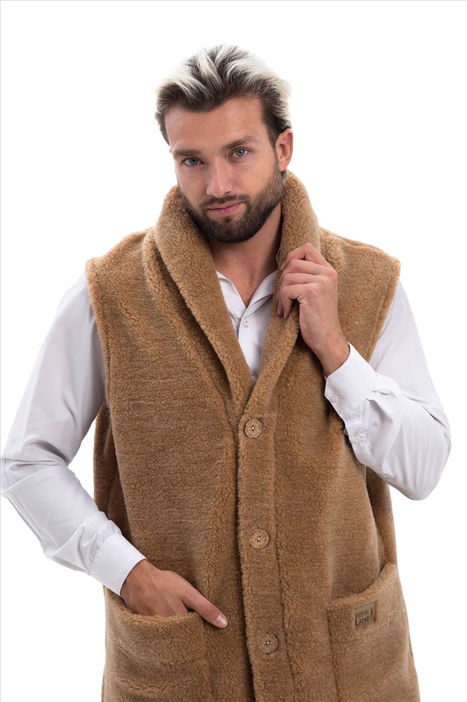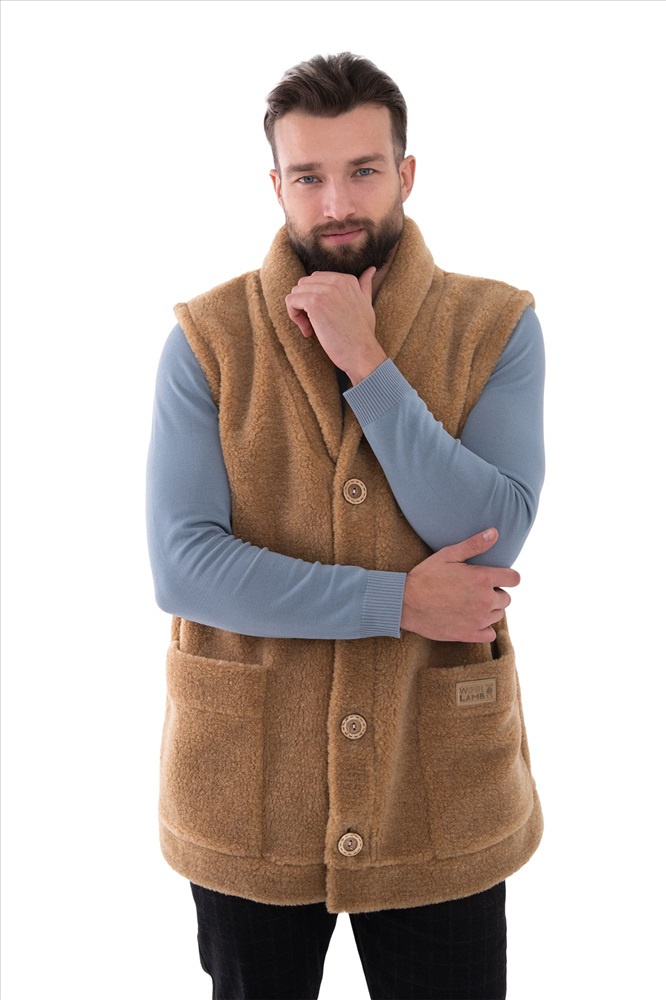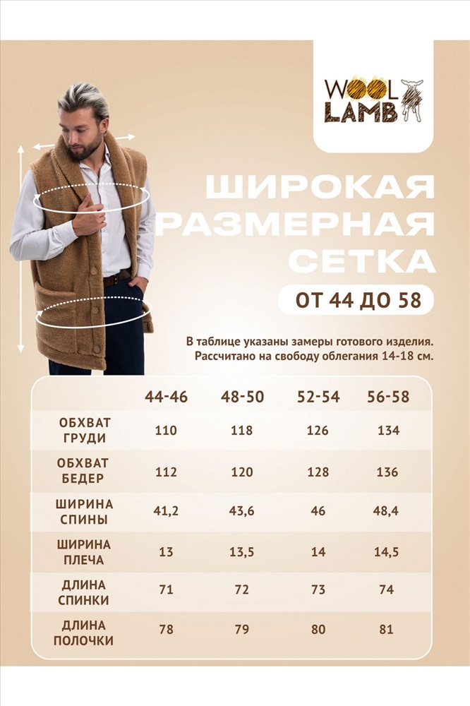 В таблице размеров указаны замеры готового изделия. Рассчитано на свободу облегания 14-18 см., Мужской жилет меховой с воротником на пуговицах из натуральной шерсти. Высота ворса 7 мм, без подкладки. Мягкий, теплый, комфортный, прямого силуэта.  Жилет можно использовать как верхний и средний слой одежды, для улицы, дома и офиса!, Удобные накладные карманы, застежка пуговицы, качественный пошив, хорошие лекала и современные расцветки сделают ваш образ максимально комфортным и стильным., Наши изделия созданы из новейшего, уникального, разработанного специально для нас, материала на основе овечьей шерсти. Невероятно мягкий, легкий, пластичный он подарит тепло и комфорт своей обладательнице. Стильный фасон отвечает всем современным тенденциям моды!, Все наши лекала уникальны и не имеют аналогов, разработаны на собственном швейном производстве фабрики WOOLLAMB, это обеспечивает отличную посадку и комфортное использование для любой фигуры., Примерная температура носки от -10 до +20 градусов, Благодаря высокому содержанию ланолина, шерсть обладает высокими оздоравливающими и согревающими свойствами, благоприятно влияет на весь организм в целом! Одежда из натуральной шерсти подарит легкость, комфорт и сухое тепло рожденное природой!, Уход за изделиями максимально прост, стирка ручная со средствами для шерсти, или сухая химчистка, при необходимости можно отпарить паровым утюгом.