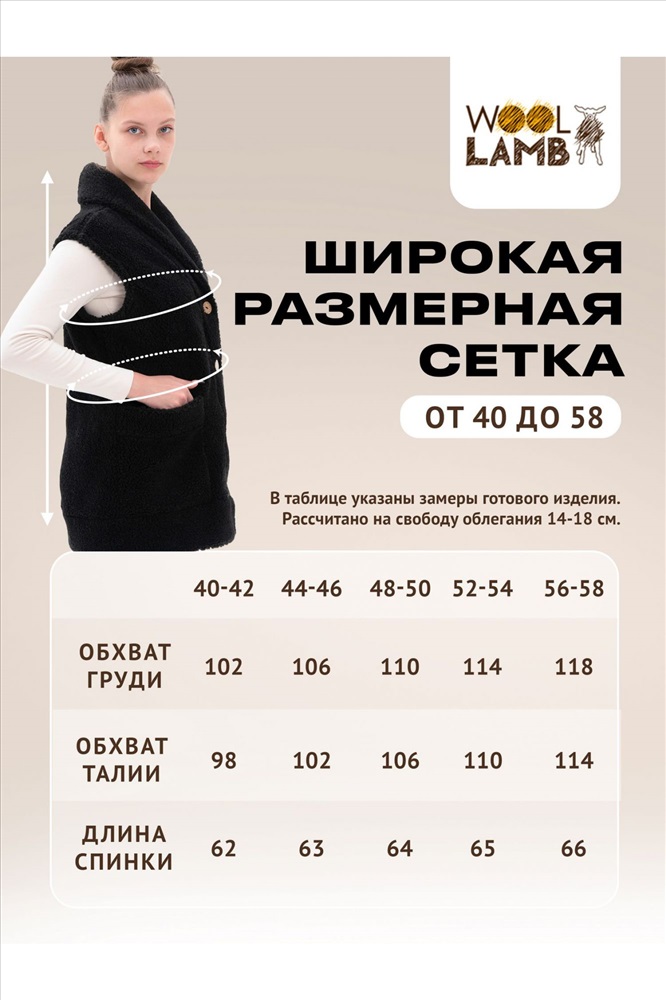 В таблице размеров указаны замеры готового изделия. Рассчитано на свободу облегания 14-18 см., Новинка! Женский меховой жилет на пуговицах из натуральной овечьей шерсти. Жилет УДЛИНЕННЫЙ, мягкий, теплый, пластичный с идеальной посадкой на женскую фигуру! Жилет можно использовать как верхний и средний слой одежды, для улицы, дома и офиса!, Глубокий карман, отложной воротник, приспущенный рукав реглан, качественный пошив, хорошие лекала и современные расцветки сделают ваш образ максимально комфортным и стильным., Наши изделия созданы из новейшего, уникального, разработанного специально для нас, материала на основе натуральной шерсти. Невероятно мягкий, легкий, пластичный он подарит тепло и комфорт своей обладательнице. Стильный фасон отвечает всем современным тенденциям моды!, Все наши лекала уникальны и не имеют аналогов, разработаны на собственном швейном производстве фабрики WOOLLAMB, это обеспечивает отличную посадку и комфортное использование для любой фигуры., Благодаря высокому содержанию ланолина, шерсть обладает высокими оздоравливающими и согревающими свойствами, благоприятно влияет на весь организм в целом! Одежда из натуральной шерсти подарит легкость, комфорт и сухое тепло рожденное природой!, Уход за изделиями максимально прост, стирка ручная со средствами для шерсти, или сухая химчистка, при необходимости можно отпарить паровым утюгом.