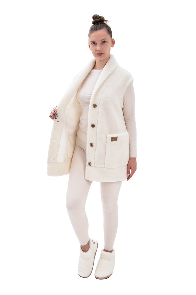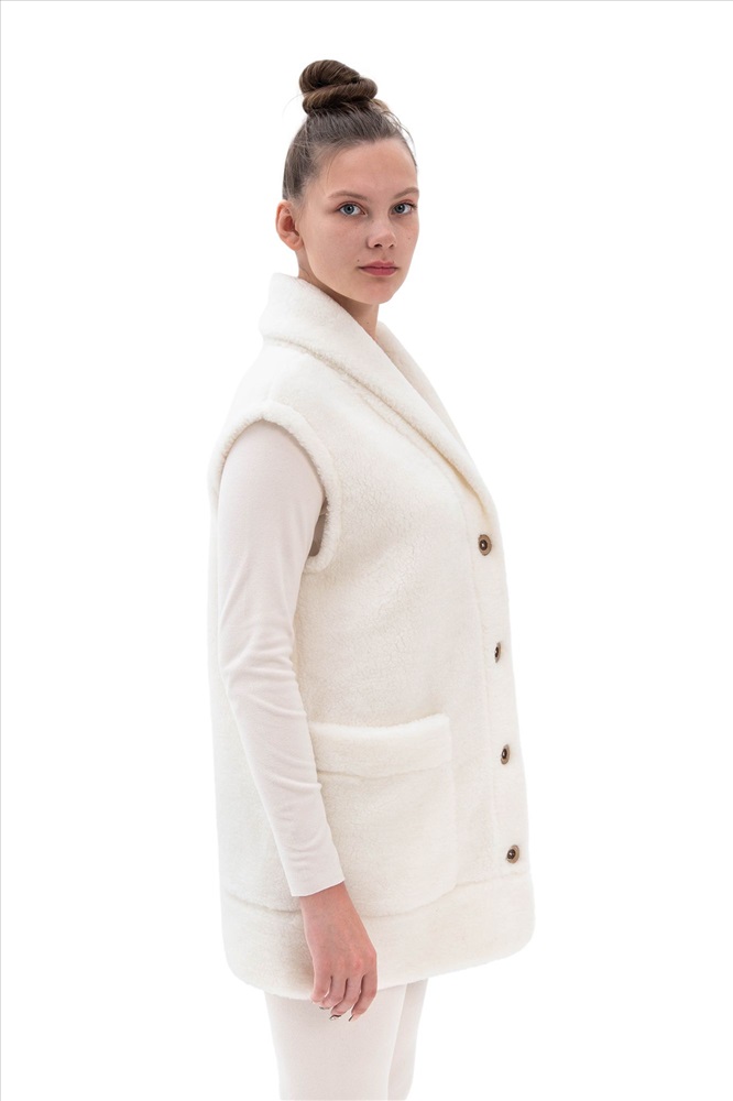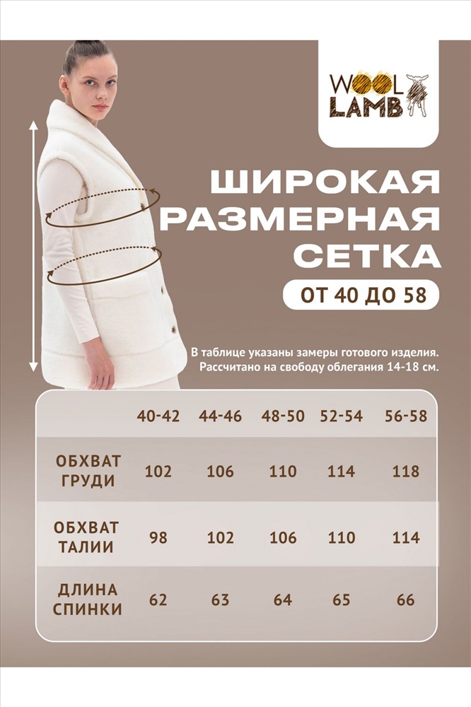 В таблице размеров указаны замеры готового изделия. Рассчитано на свободу облегания 14-18 см., Новинка! Женский меховой жилет на пуговицах из натуральной овечьей шерсти. Жилет УДЛИНЕННЫЙ, мягкий, теплый, пластичный с идеальной посадкой на женскую фигуру! Жилет можно использовать как верхний и средний слой одежды, для улицы, дома и офиса!, Глубокий карман, отложной воротник, приспущенный рукав реглан, качественный пошив, хорошие лекала и современные расцветки сделают ваш образ максимально комфортным и стильным., Наши изделия созданы из новейшего, уникального, разработанного специально для нас, материала на основе натуральной шерсти. Невероятно мягкий, легкий, пластичный он подарит тепло и комфорт своей обладательнице. Стильный фасон отвечает всем современным тенденциям моды!, Все наши лекала уникальны и не имеют аналогов, разработаны на собственном швейном производстве фабрики WOOLLAMB, это обеспечивает отличную посадку и комфортное использование для любой фигуры., Благодаря высокому содержанию ланолина, шерсть обладает высокими оздоравливающими и согревающими свойствами, благоприятно влияет на весь организм в целом! Одежда из натуральной шерсти подарит легкость, комфорт и сухое тепло рожденное природой!, Уход за изделиями максимально прост, стирка ручная со средствами для шерсти, или сухая химчистка, при необходимости можно отпарить паровым утюгом.