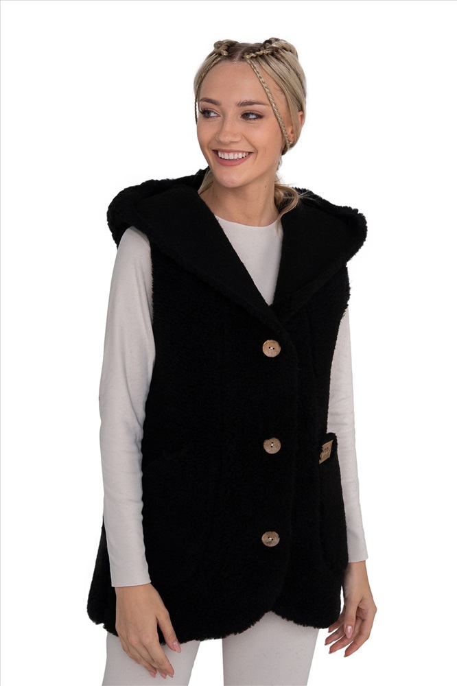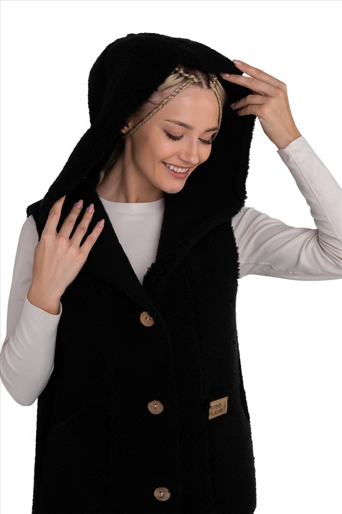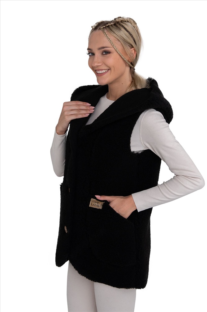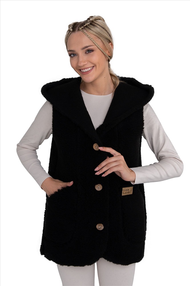 В таблице размеров указаны замеры готового изделия. Рассчитано на свободу облегания 14-18 см., Жилет меховой жилет С КАПЮШОНОМ  на пуговицах женский, из натуральной овечьей шерсти. Высота ворса 12 мм, изнутри меховой начес 2-3 мм. Жилет БЕЗ ОТДЕЛКИ КРАЯ, благодаря этому жилет более мягкий и пластичный, не сыпется,  с идеальной посадкой на женскую фигуру! Жилет можно использовать как верхний и средний слой одежды, для улицы, дома и офиса!, Глубокий карман, удобный большой капюшон, качественный пошив, хорошие лекала и современные расцветки сделают ваш образ максимально комфортным и стильным., Наши изделия созданы из новейшего, уникального, разработанного специально для нас, материала на основе натуральной шерсти. Невероятно мягкий, легкий, пластичный он подарит тепло и комфорт своей обладательнице. Стильный фасон отвечает всем современным тенденциям моды!, Все наши лекала уникальны и не имеют аналогов, разработаны на собственном швейном производстве фабрики WOOLLAMB, это обеспечивает отличную посадку и комфортное использование для любой фигуры., Благодаря высокому содержанию ланолина, шерсть обладает высокими оздоравливающими и согревающими свойствами, благоприятно влияет на весь организм в целом! Одежда из натуральной шерсти подарит легкость, комфорт и сухое тепло рожденное природой!, Уход за изделиями максимально прост, стирка ручная со средствами для шерсти, или сухая химчистка, при необходимости можно отпарить паровым утюгом.