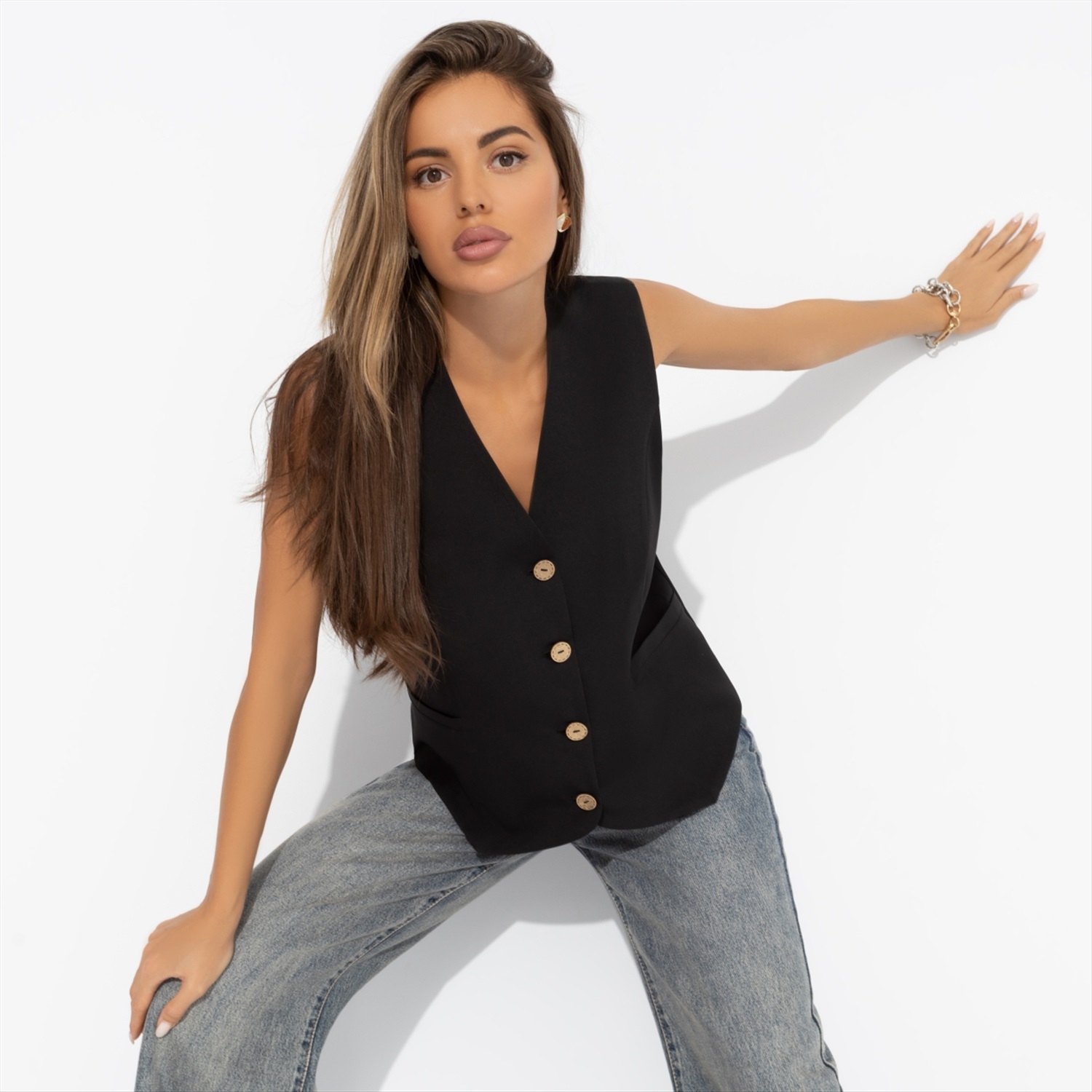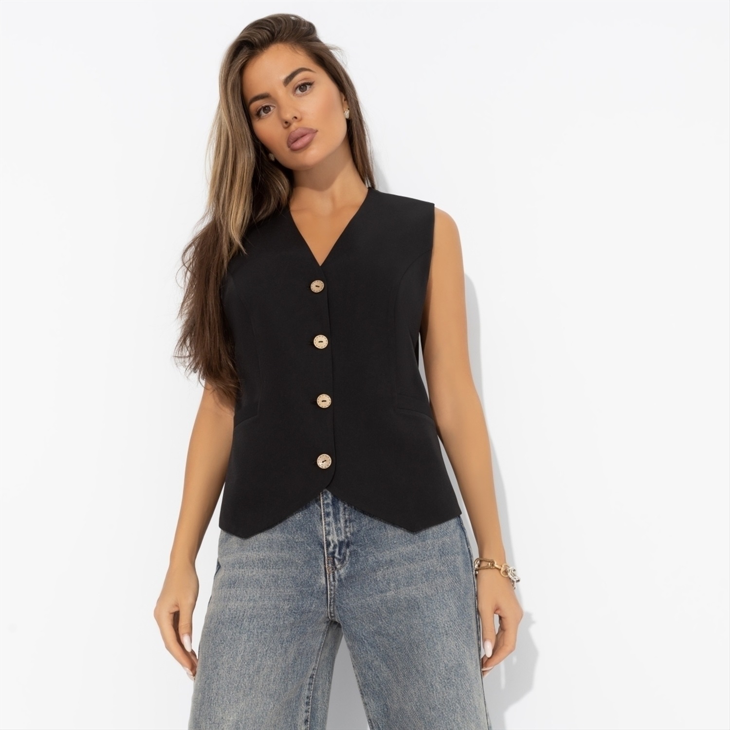 Состав: «Барби» (95% п/э, 5% эластан) Плотность ткани: Средняя Тип ткани: Текстиль Вид застежки: Пуговица/-ы Карманы: Нет Основной цвет ткани: Черный Отрезная талия: Есть Подклад: Нет Резинка по талии: Есть Рисунок/раппорт: Нет, все изделия идентичны Сезон: Круглогодичный Силуэт: Приталенный Стиль: Деловой Параметры модели на фото: