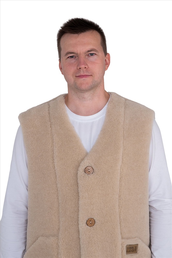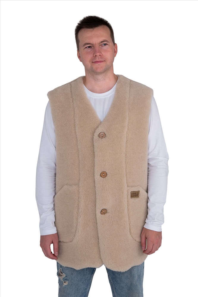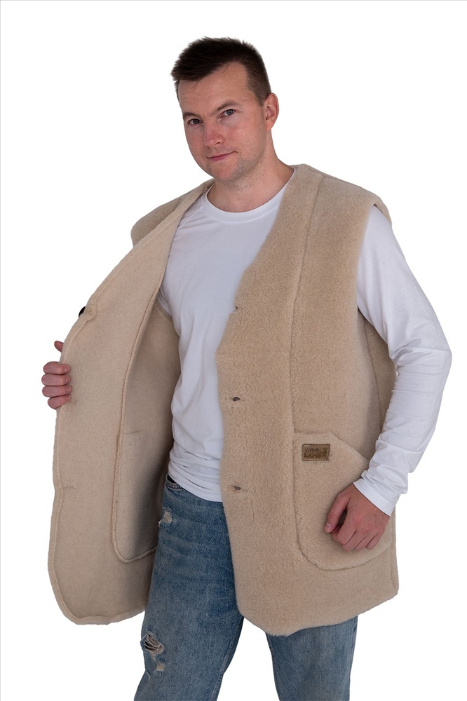 В таблице размеров указаны замеры готового изделия. Рассчитано на свободу облегания 14-18 см., Мужской жилет меховой на пуговицах, БЕЗ ОТДЕЛКИ КРАЯ, без воротника, из натуральной шерсти. Высота ворса 12 мм, без подкладки, изнутри шерстяной начес 2-3 мм.  Мягкий, теплый, комфортный, прямого силуэта.  Жилет можно использовать как верхний и средний слой одежды, для улицы, дома и офиса!, Удобные накладные карманы, застежка пуговицы, качественный пошив, хорошие лекала и современные расцветки сделают ваш образ максимально комфортным и стильным., Наши изделия созданы из новейшего, уникального, разработанного специально для нас, материала на основе овечьей шерсти. Невероятно мягкий, легкий, пластичный он подарит тепло и комфорт своей обладательнице. Стильный фасон отвечает всем современным тенденциям моды!, Все наши лекала уникальны и не имеют аналогов, разработаны на собственном швейном производстве фабрики WOOLLAMB, это обеспечивает отличную посадку и комфортное использование для любой фигуры., Примерная температура носки от -10 до +20 градусов, Благодаря высокому содержанию ланолина, шерсть обладает высокими оздоравливающими и согревающими свойствами, благоприятно влияет на весь организм в целом! Одежда из натуральной шерсти подарит легкость, комфорт и сухое тепло рожденное природой!, Уход за изделиями максимально прост, стирка ручная со средствами для шерсти, или сухая химчистка, при необходимости можно отпарить паровым утюгом.