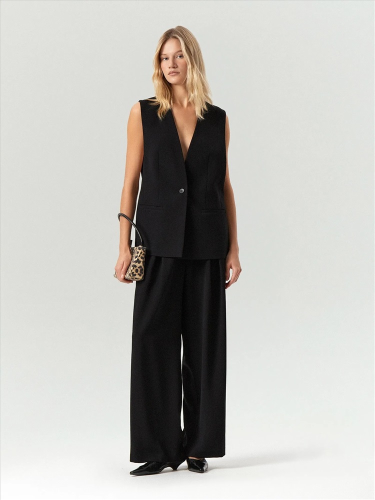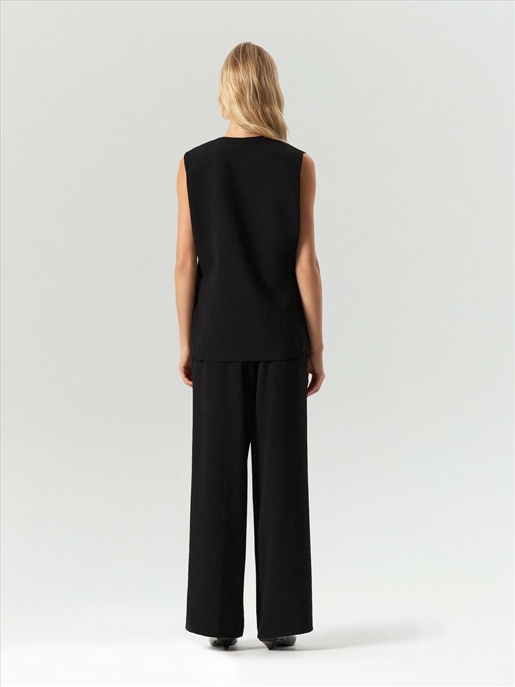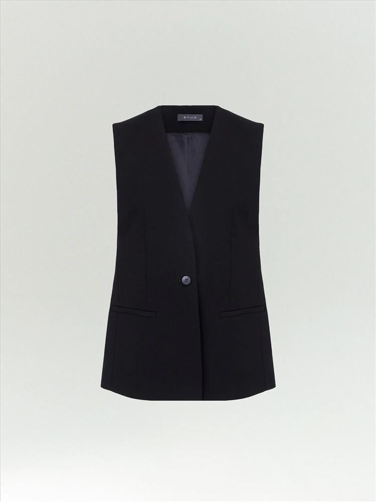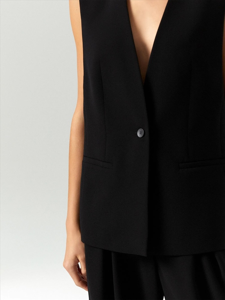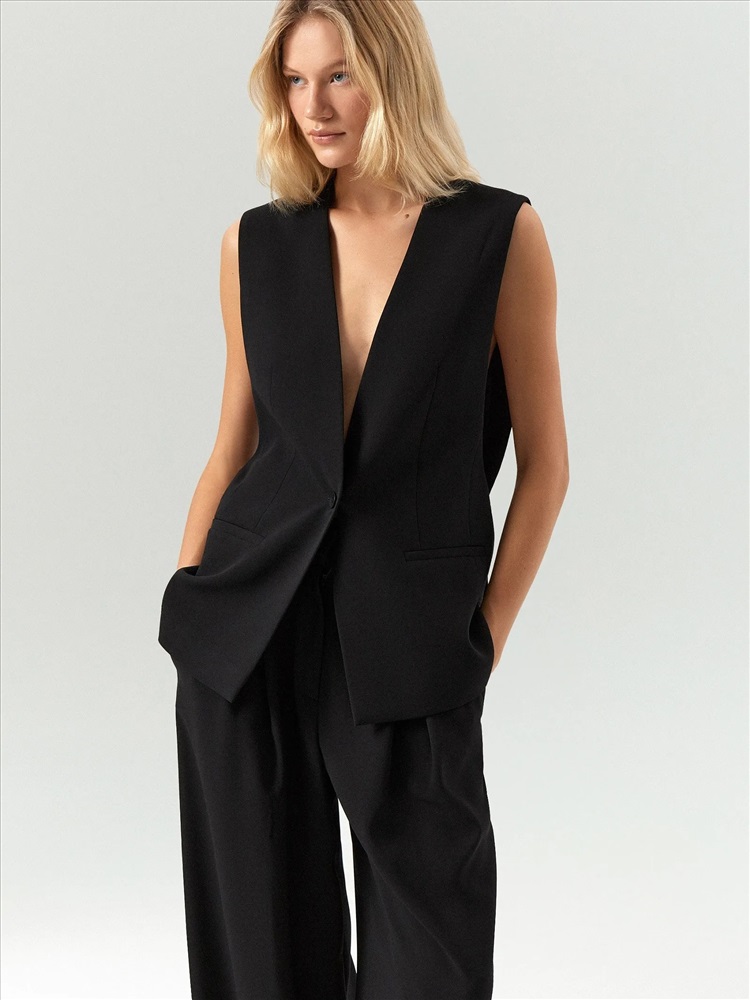 Чёрный жилет прямого кроя для эффектных деловых и повседневных образов, а также образов к особому случаю. Удлинённая модель на одной пуговице имеет трендовый глубокий V-вырез и углублённые проймы, что делает её оригинальнее и удобнее для создания многослойных образов. Изделие выполнено из материала с высоким содержанием вискозы, на подкладке. Дополнить жилет можно брюками или другим низом из комплекта, блузами и рубашками.