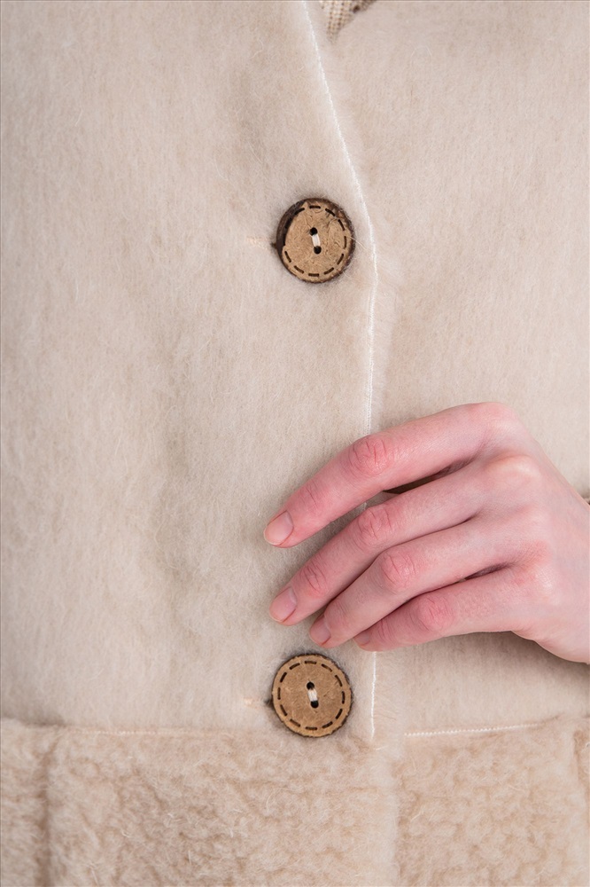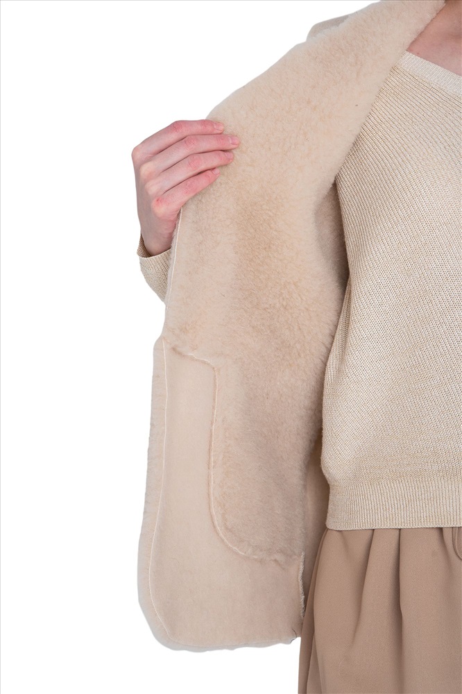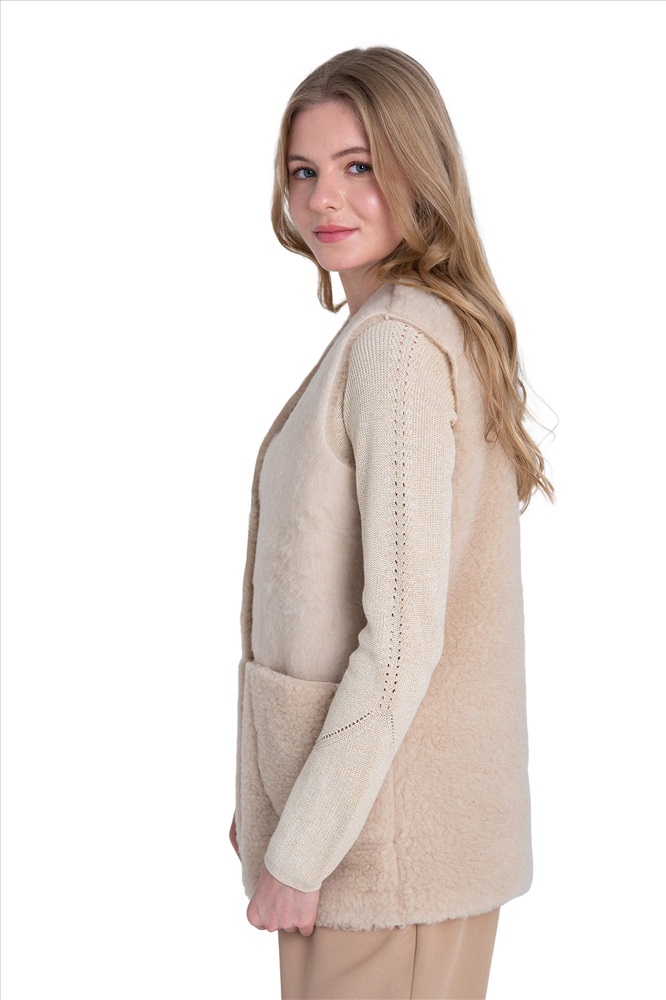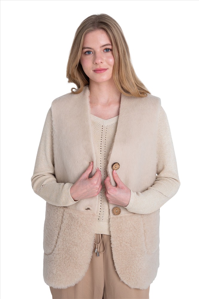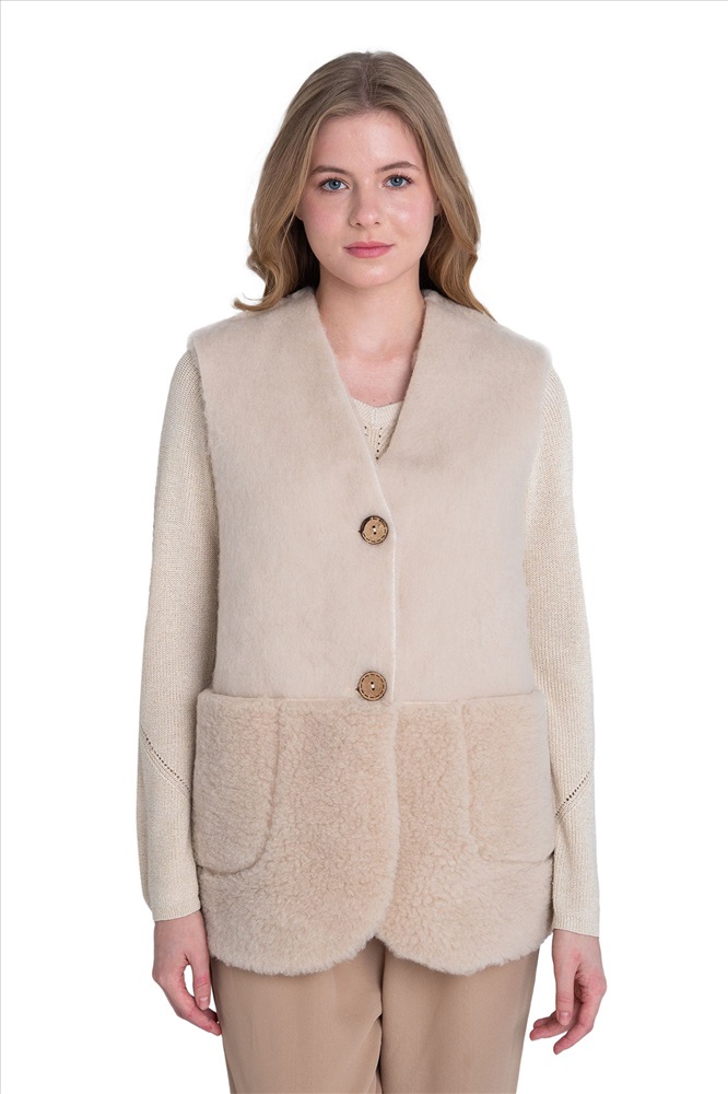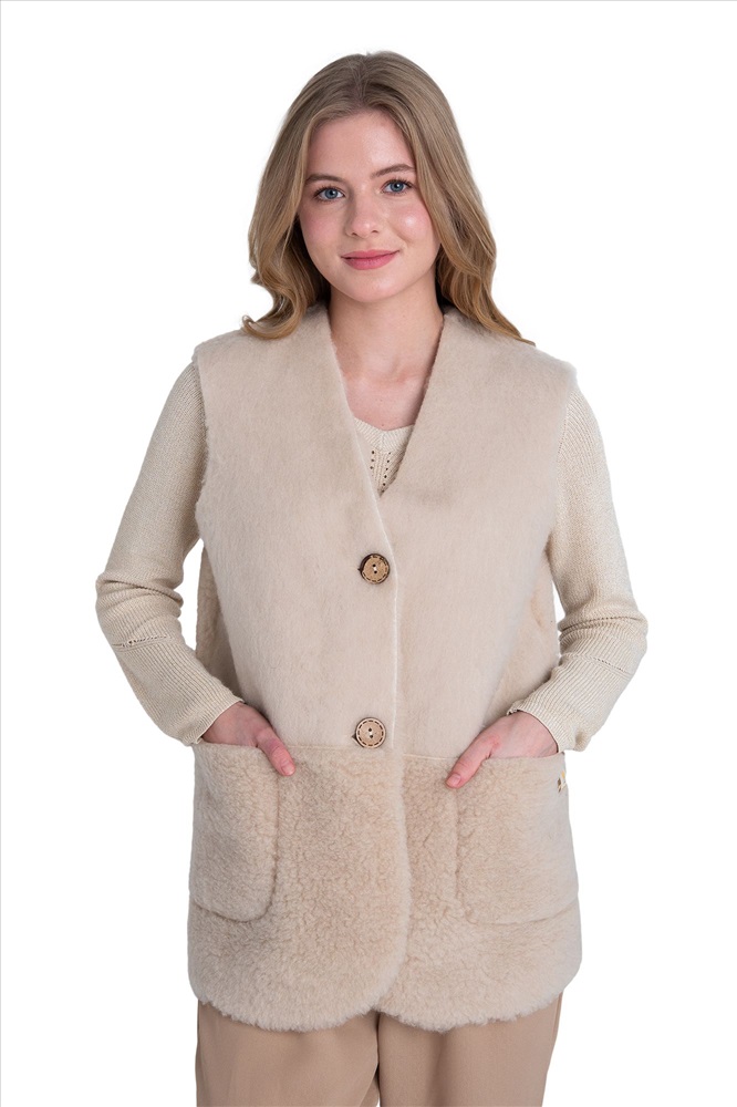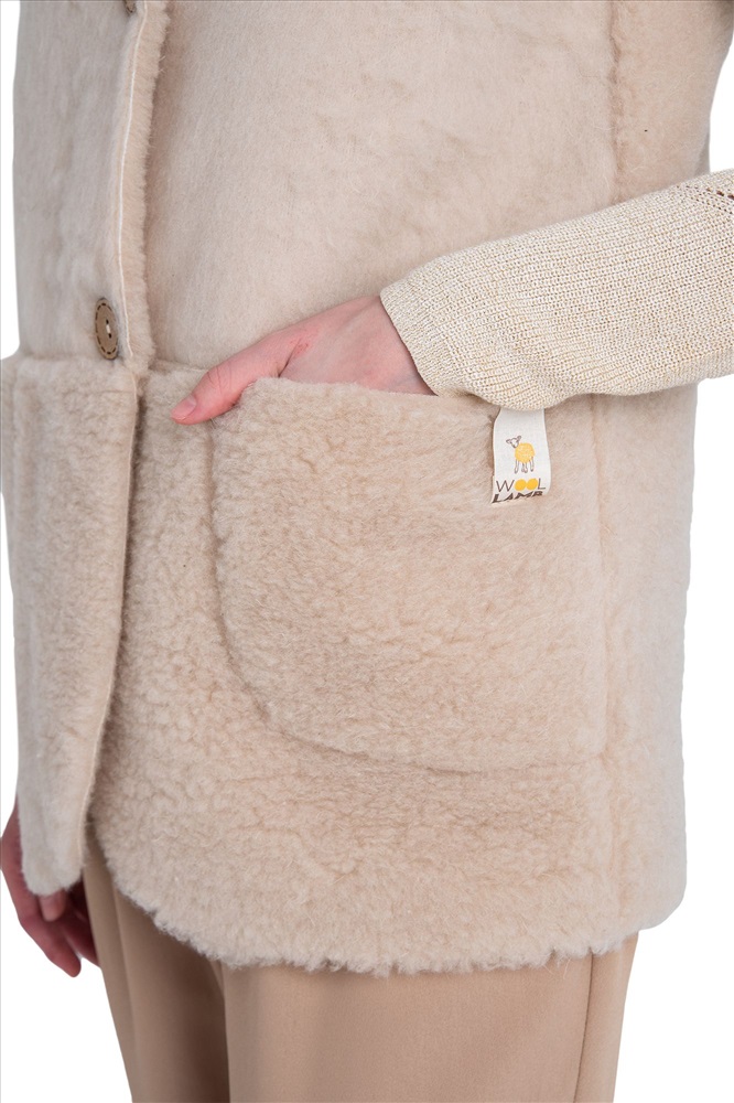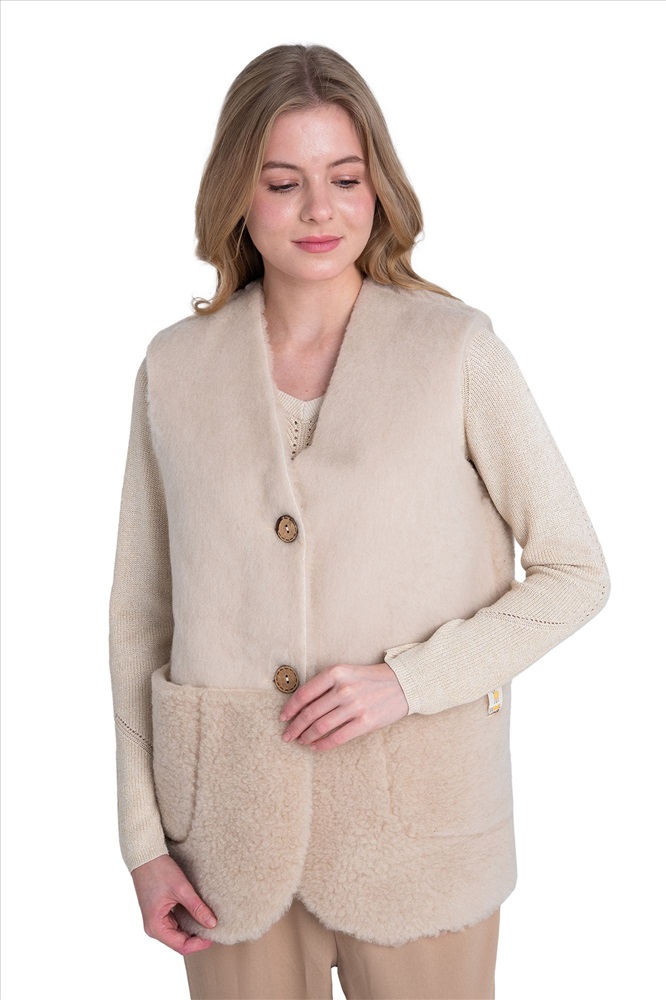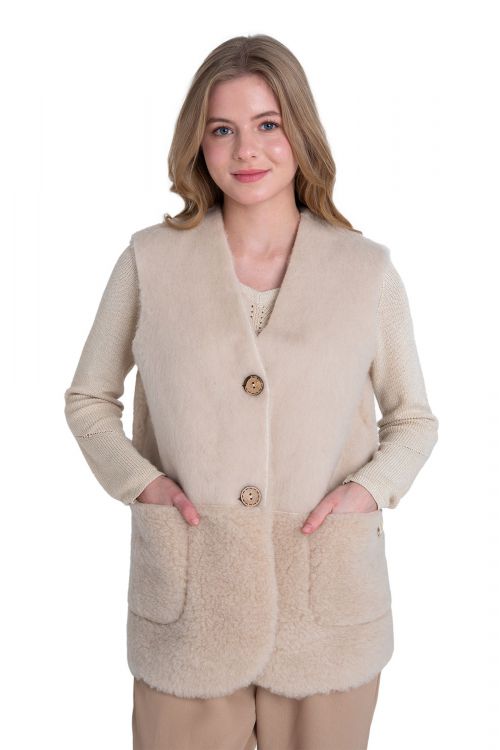 Жилет меховой жилет на пуговицах из натуральной овечьей шерсти. Высота ворса 12 мм, изнутри меховой начес 2-3 мм. Жилет БЕЗ ОТДЕЛКИ КРАЯ, благодаря этому жилет более мягкий и пластичный, не сыпется,  с идеальной посадкой на женскую фигуру! Жилет можно использовать как верхний и средний слой одежды, для улицы, дома и офиса!, Глубокий накладной карман, оригинальный дизайн, качественный пошив, хорошие лекала и современные расцветки сделают ваш образ максимально комфортным и стильным., Наши изделия созданы из новейшего, уникального, разработанного специально для нас, материала на основе натуральной шерсти. Невероятно мягкий, легкий, пластичный он подарит тепло и комфорт своей обладательнице. Стильный фасон отвечает всем современным тенденциям моды!, Все наши лекала уникальны и не имеют аналогов, разработаны на собственном швейном производстве фабрики WOOLLAMB, это обеспечивает отличную посадку и комфортное использование для любой фигуры., Благодаря высокому содержанию ланолина, шерсть обладает высокими оздоравливающими и согревающими свойствами, благоприятно влияет на весь организм в целом! Одежда из натуральной шерсти подарит легкость, комфорт и сухое тепло рожденное природой!, Уход за изделиями максимально прост, стирка ручная со средствами для шерсти, или сухая химчистка, при необходимости можно отпарить паровым утюгом.