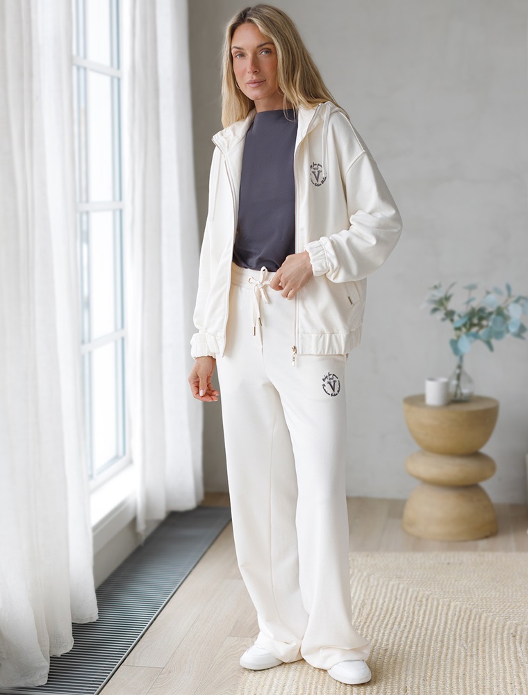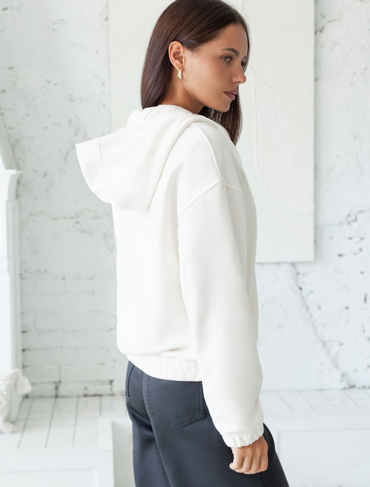 Размер товара на первом фото: 42 Уютное и стильное зип худи белого цвета на молнии и с капюшоном — идеальный выбор для создания модного повседневного образа в прохладную погоду. Выполнено из эластичного футера трехнитки, натуральный материал дарит комфортное ощущение на протяжении всего дня и отличную воздухопроницаемость. Модель дополнена вышитым логотипом бренда и боковыми карманами. Капюшон со шнуром, резинка по низу и манжеты на рукавах придают джемперу комфорт. Практичная молния делает худи удобным для быстрого переодевания и добавляет нотку спорт шика вашему стилю. Свободный крой подходит для девушек и женщин с фигурой плюс сайз, при этом подчеркивая достоинства и современный образ обладательницы этого спортивного джемпера. Зипка гармонично сочетается с джинсами, брюками или леггинсами, помогая легко составить как расслабленный городской аутфит, так и актуальный спортивный лук для прогулок или встреч с друзьями. Универсальность модели позволяет вписать ее в любой гардероб — она станет базовой вещью для тех, кто ценит практичность вместе с модными тенденциями. Комментарии к товару