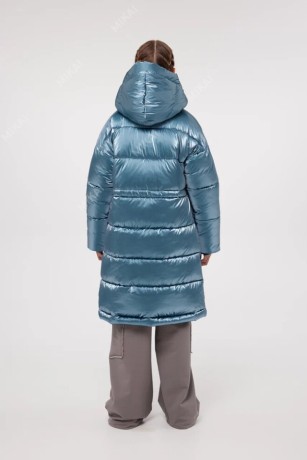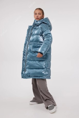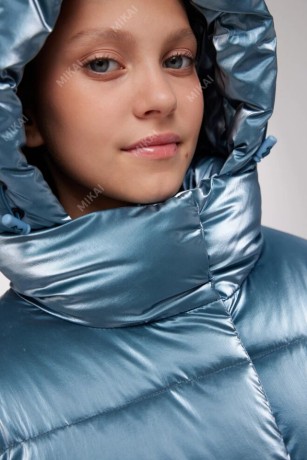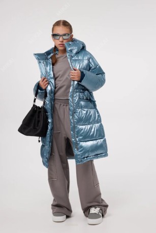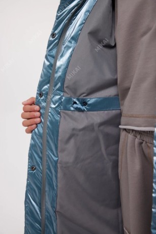 Округлая 3-D форма рукава создана за счет шва и вытачек в области локтя. Воротник-стойка на кнопках, объемный со вставкой справа. Застежка центральная на молнию, с цельнокроеной верхней ветрозащитной планкой, застегивающейся на потайные кнопки. Изделие стеганое широкими гоизонтальными переборками. На талии выполнена регулируемая кулиса .На переде расположены боковые горизонтальные прорезные карманы с клапанами. Низ рукавов оформлен удлиненными трикотажными манжетами с вырезом для большого пальца. Капюшон несъемный,втачанный в воротник. Край капюшона-с кулисой, регулируемой шнуром-резинкой и стопорами. По низу изделия регулируемая кулиса.